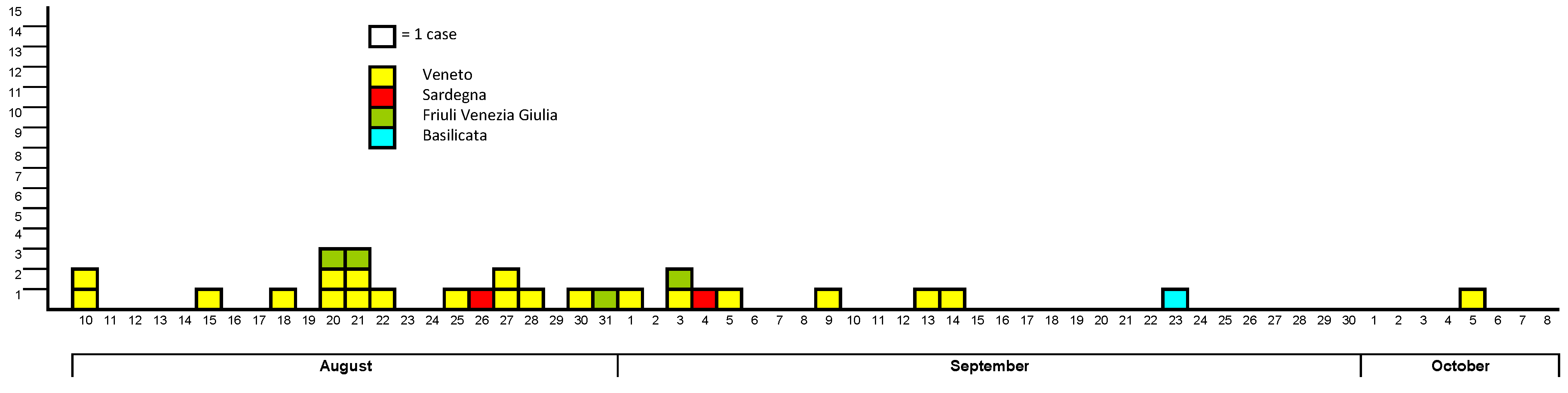 - Barzon, L.; Pacenti, M.; Cusinato, R.; Cattai, M.; Franchin, E.; Pagni, S.; Martello, T.; Bressan, S.; Squarzon, L.; Cattelan, A.M.; et al. Human cases of West Nile virus infection in north-eastern Italy, 15 June to 15 November 2010. Euro Surveill. 2011, 16, 19949. [Google Scholar]