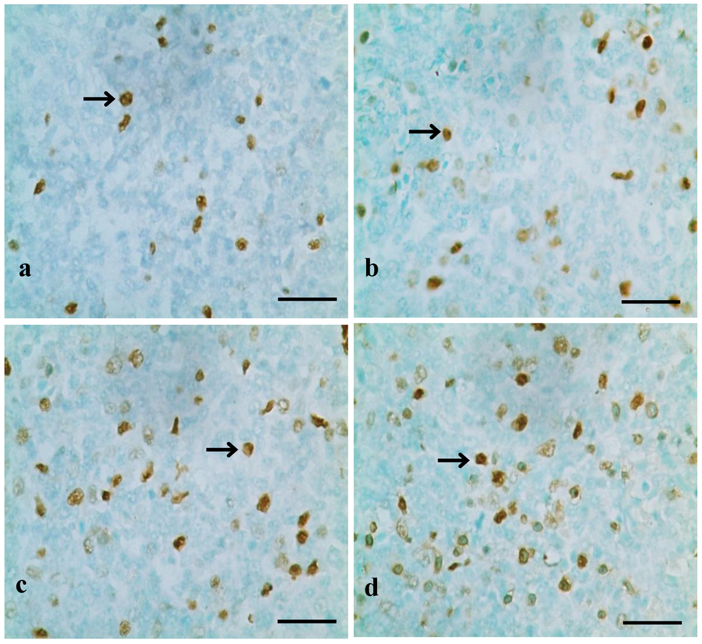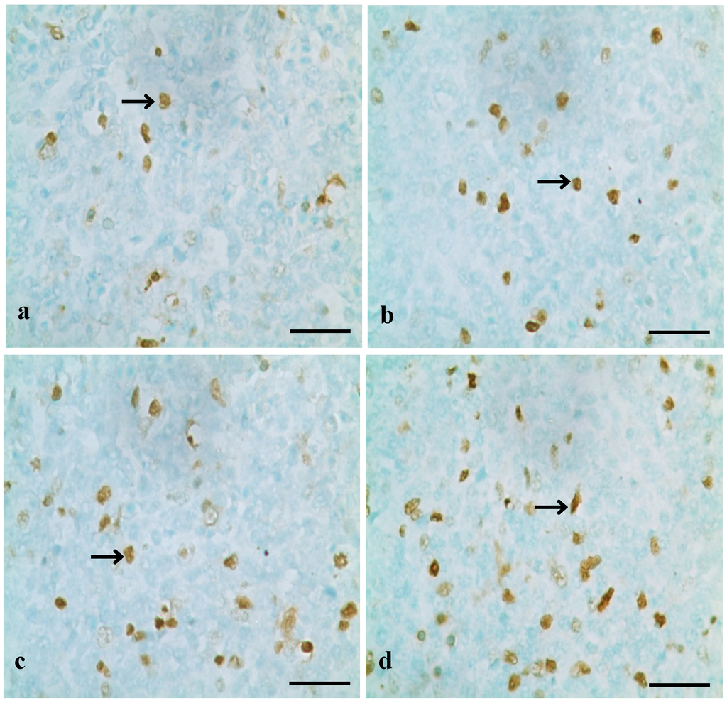 Five broilers in each group were euthanized at 14, 28 and 42 days of age for gross examination. Spleens were removed, fixed in 4% neutral buffered paraformaldehyde, and embedded in paraffin. The terminal dexynucleotidyl transferase (TdT)-mediated dUTP nick end labeling (TUNEL) assay was performed in the deparaffinized section (5 μm thick) with an apoptosis detection kit (EMD Biosciences, Inc. La Jolla, CA, USA) according to the manufacturer’s instructions. Briefly, splenic slices were rehydrated in a series of xylene and ethanol solutions and then incubated in a humidified chamber at room temperature for 20 min with proteinase K (Cat. No: JA 1477, EMD Biosciences, Inc. La Jolla, CA, USA). Slices were then rinsed with tris-buffered saline (TBS). The entire specimens were covered with 3% H2O2 and then incubated at room temperature for 5 min. Slices were rinsed with TBS. TUNEL enzyme (Cat. No. JA 1559, EMD Biosciences, Inc. La Jolla, CA, USA) and label solution (Cat. No. JA 1560, EMD Biosciences, Inc. La Jolla, CA, USA) were mixed and applied to slices, which were incubated again in the humidified chamber for 1 h at 37 °C. Slices were thoroughly rinsed with TBS. Stop buffer, block buffer, and conjugate were applied in turn. Diaminobenzidine solution was applied for 10–15 min to stain the nuclei of apoptotic cells. The methyl green solution was used to counterstain the nuclei of normal cells. Slices were dehydrated in a series of three ethanol baths and twice xylene baths, 5 min for each. The positive cells were quantified using Image-Pro Plus 5.1 (Media Cybernetics, Inc. Bethesda, MD, USA). Five slices were measured in each group and five microscopic areas (randomly chosen) were measured in each slice. Then the numbers were averaged.