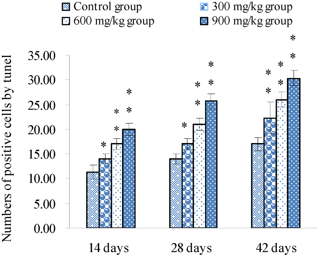 TUNEL assays showed that the nuclei of positive cells were stained in brown (Figure 1, Figure 2 and Figure 3). The results in Figure 4 show that the number of apoptotic splenocytes was significantly higher (p < 0.05 or p < 0.01) in the 300 mg/kg, 600 mg/kg and 900 mg/kg groups from 14 to 42 days of age than those in the control group.