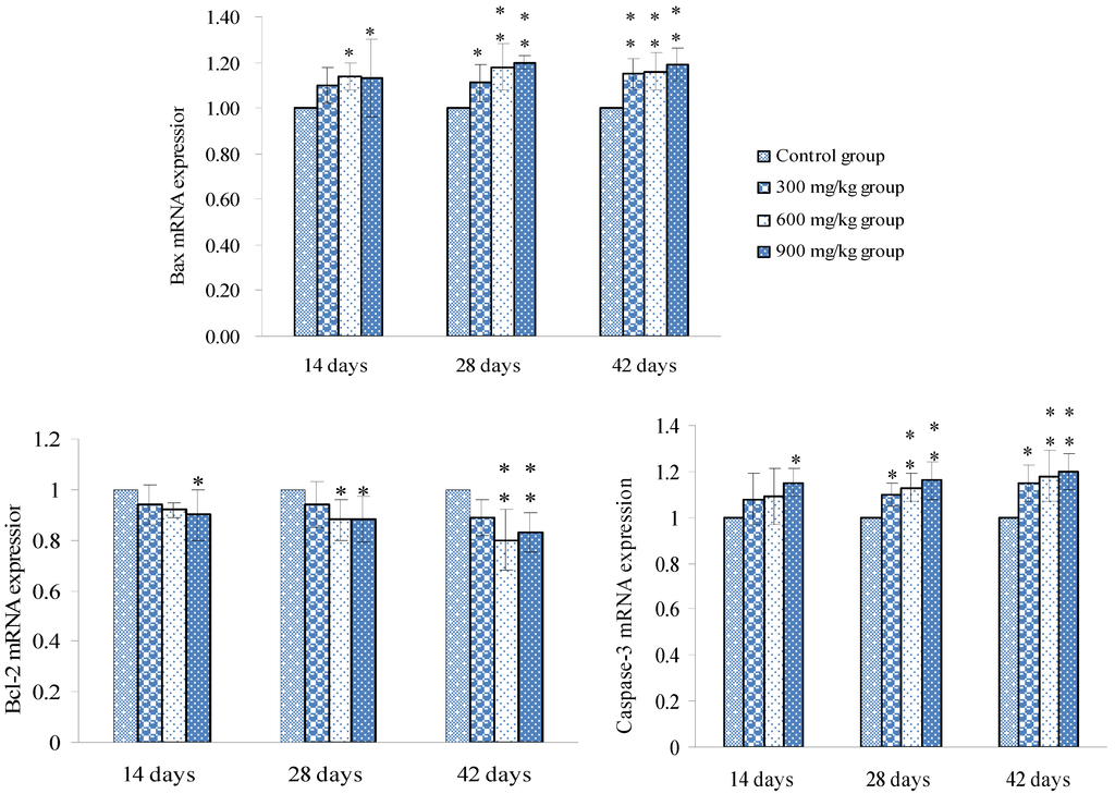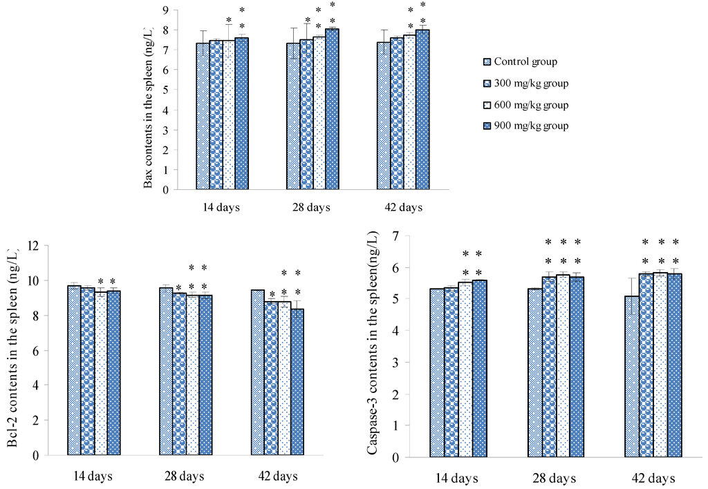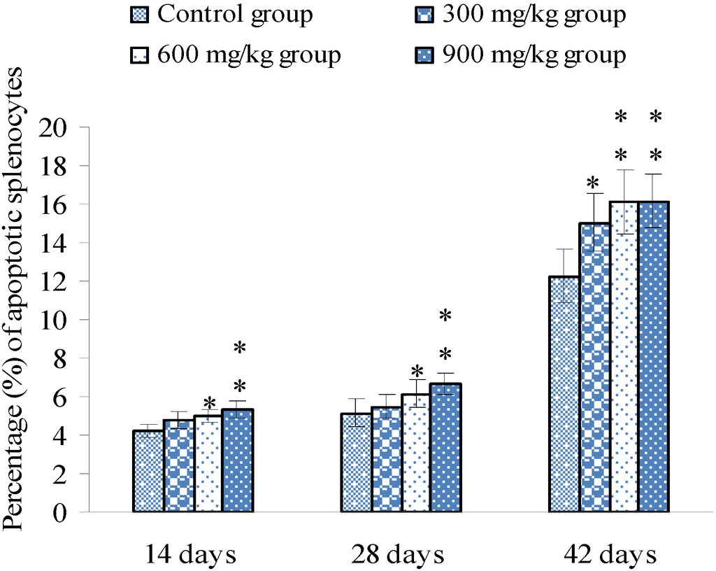Apoptosis detection by FCM showed that the percentages of apoptotic splenocytes were significantly increased (p < 0.05 or p < 0.01) in the 600 and 900 mg/kg groups from 14 to 42 days of age, and in the 300 mg/kg group at 42 days of age when compared with those of the control group, as shown in Figure 5.