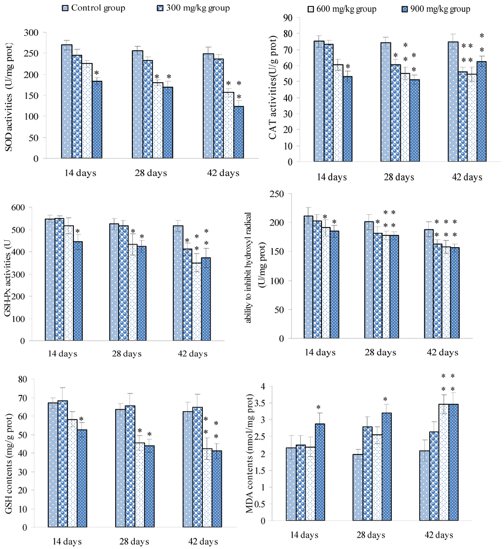 Changes of the SOD, CAT and GSH-Px activities, the ability to inhibit hydroxyl radical, GSH and MDA contents were shown in Figure 8.