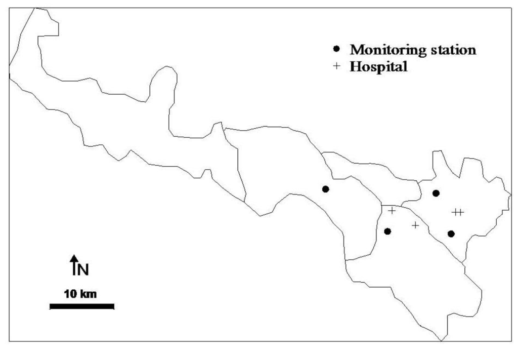 The air pollution data during the study period, including sulfur dioxide (SO2), nitrogen dioxide (NO2), and particulate matter less than 10 μm in aerodynamic diameter (PM10), were obtained from the Lanzhou Environmental Monitoring Center. The center is part of a nationwide network of monitoring stations and reports daily observations to the China Environmental Monitoring Chief Station. The daily concentrations of each pollutant were averaged from the available monitoring results of four fixed stations located in the urban district of Lanzhou (Figure 1). In calculating the daily data there should be at least 75% 1-h values of that particular day, and for each monitoring station there should be at least 75% of daily data complete for the whole study period. The measurement methods for NO2, SO2, and PM10 were chemiluminescence, ultraviolet absorption, and tapered element oscillating microbalance, respectively. To allow adjustment for the effect of weather on hospital admissions, daily average temperature and relative humidity during the study period were obtained from the Gansu Meteorological Bureau.