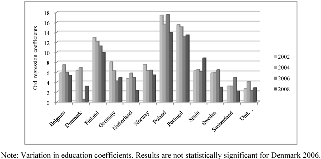 The impact of education is described in Figure 3. On the one hand, the higher association of education with SRH as compared to income is quite relevant. If we look at the ranges of coefficients for the two variables, the relevance of education is seen to even triplicate that of income (income range: 0.5 to 4.0; education range: 0.2 to 16.0). On the other hand, there is a steady decrease in education-related differences these years, especially in Scandinavian and Central European countries. That is, the impact of education on individuals’ general health has fallen moderately during this period. In the UK, as an exception, the impact of education remains relatively constant in the period 2002–2008 and it is even lower than the effect of income. For that reason, education has a mild impact in the UK, whilst it is not statistically significant in Ireland. In Central European countries, the positive relationship of education with SRH is still higher than that of income but, on the other hand, this relationship does not follow a stable pattern. In general terms, we can say that the effect of education progressively decreases during this period in Belgium, Germany, France, Netherlands and Switzerland. There are, however, some exceptions (e.g., Austria, where this effect is growing).
