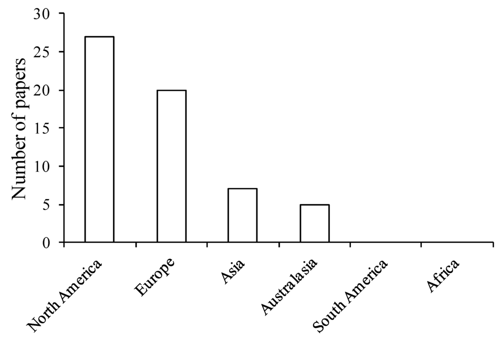 Number of studies undertaken in each continent (n = 59). Where a study investigated more than geographical location, each location is separately included.