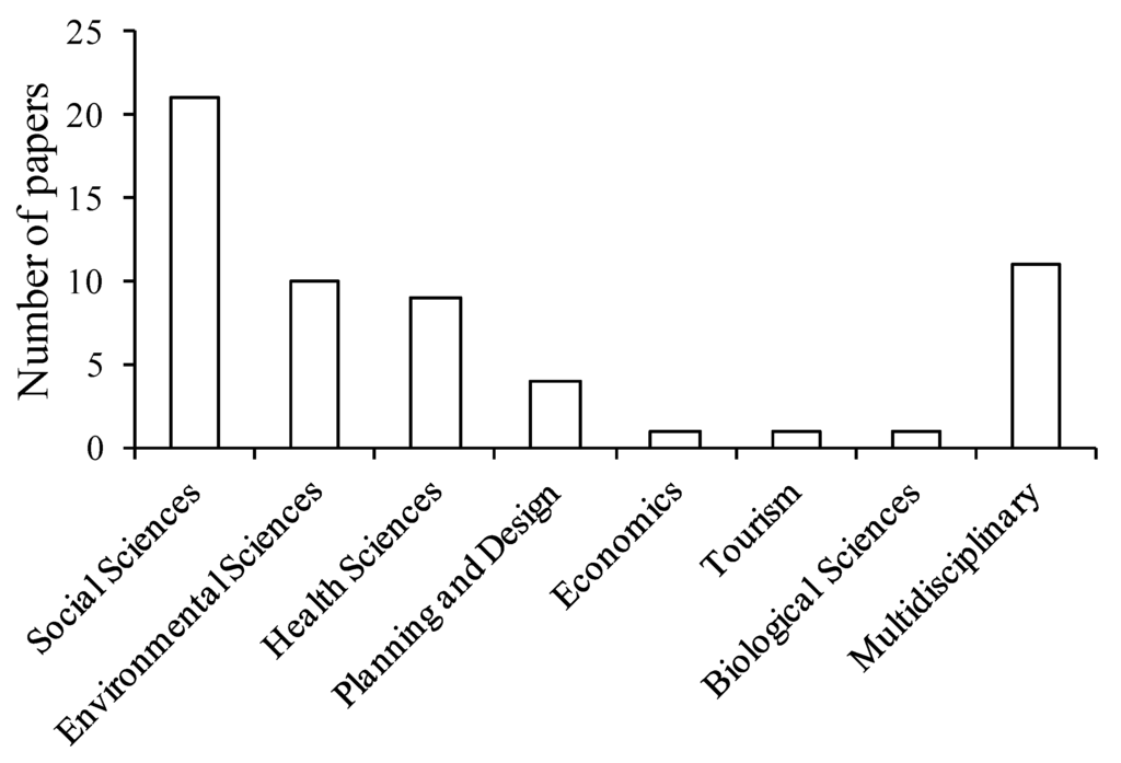 The reviewed studies were published in journals from a broad range of research disciplines (Figure 2). Social science was the most represented discipline; health and environmental sciences were much less heavily represented and only one of the reviewed studies was published from the biological sciences. This bias towards the social sciences and clear deficiency of input from the biological sciences may be constraining understanding of the beneficial interactions between people and nature. Without collaboration from biologists and ecologists, it will be difficult to evaluate the importance of biodiversity and ecological quality of natural environments as mechanisms behind these beneficial interactions.
