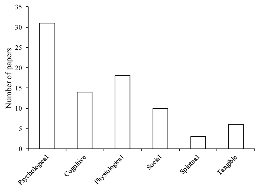 Second, we examine the types of benefits studied to understand whether some have received more focus than others. For example, the growing availability of databases of health status or interventions and detailed land maps has facilitated correlational investigation of access to green space with health outcomes such as morbidity, e.g., [,]. In contrast, less tangible benefits such as spiritual well-being or social cohesion may be more challenging to study.