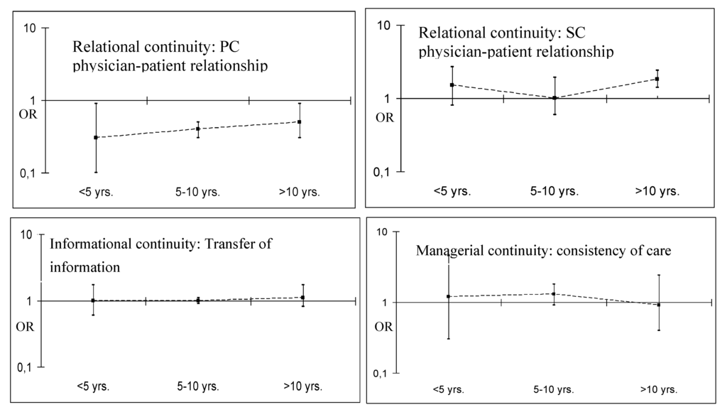 Given the heterogeneity of the immigrant population in aspects such as native language or type of health system in their country of origin [], it is be expected that immigrants’ perceptions of relational continuity are also highly heterogeneous. In addition, results indicated that their relationship with primary care physicians tends to improve with their length of stay. This finding could be explained by the fact that some factors which negatively affect immigrant perceptions of relational continuity with primary care professionals, such as language proficiency or their expectations and attitude towards professionals, are modified with time. Nevertheless, as mentioned above, although the perception of immigrants improves with the length of stay, their perceptions are always worse than those observed in the native population.