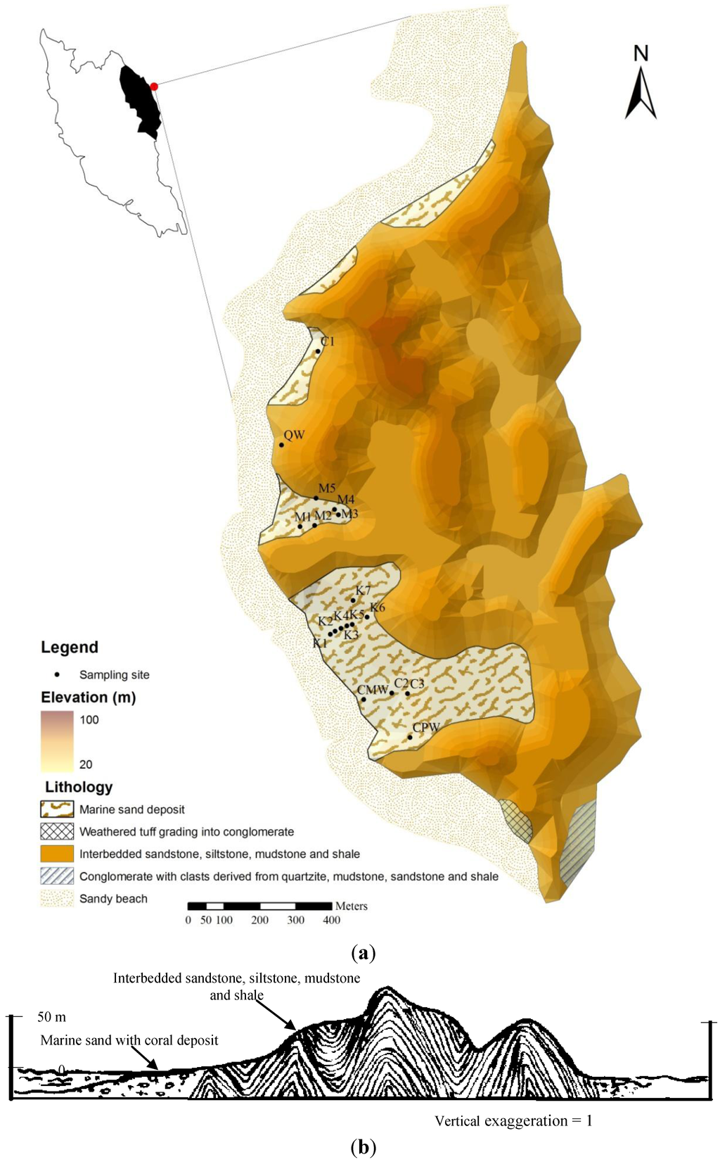 Map of study area showing sampling sites, elevation and lithology of the island (a) and (b) cross section of the island from west to east. Modified from [18].