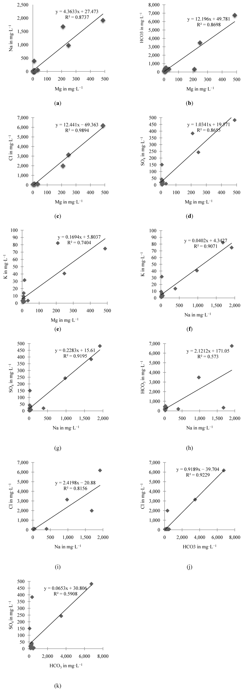 Moreover, this area was characterized by the lowest HCO3 48 mg·L−1 and high SO4, which may be as a result of the runoff waterways that continue to moisturize the area and increase the dissolved organic carbon (DOC), eventually leading to a decrease in pH [28]. Furthermore, chemical reactions in the area may also influence redox reaction due to leaching from sewage; hence sewage and DOC are believed to have a significant influence on redox reaction [29]. Total dissolved solids (TDS) values on the island range from 70 to >8,000 mg·L−1, indicating the likelihood of seawater intrusion. TDS, EC and salinity were strongly correlated with all the major ions except NO3, which indicates that TDS, EC and salinity are influenced by these major ions. The order of abundance for the cations was found to be Na > Mg > Ca > K and for anions was HCO3> Cl > SO4 > NO3. The HCO3 was found to be the most abundant anion in the study area. The presence of HCO3 in the groundwater could be due to the dissolution of carbonate materials from the corals found in the marine sand deposits [18].