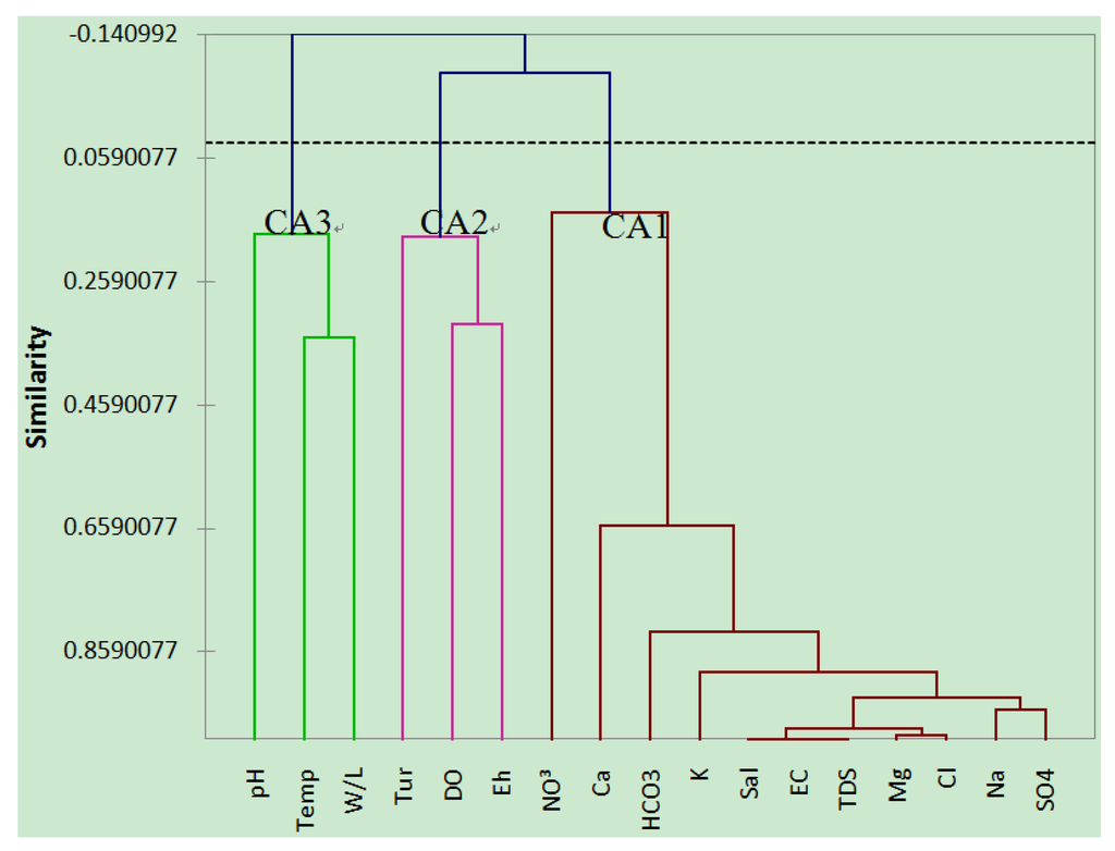 Cluster analysis was applied to the groundwater variables and the resulting factors were classified into three major groups based on the similarities among the variables and dissimilarities to other groups.