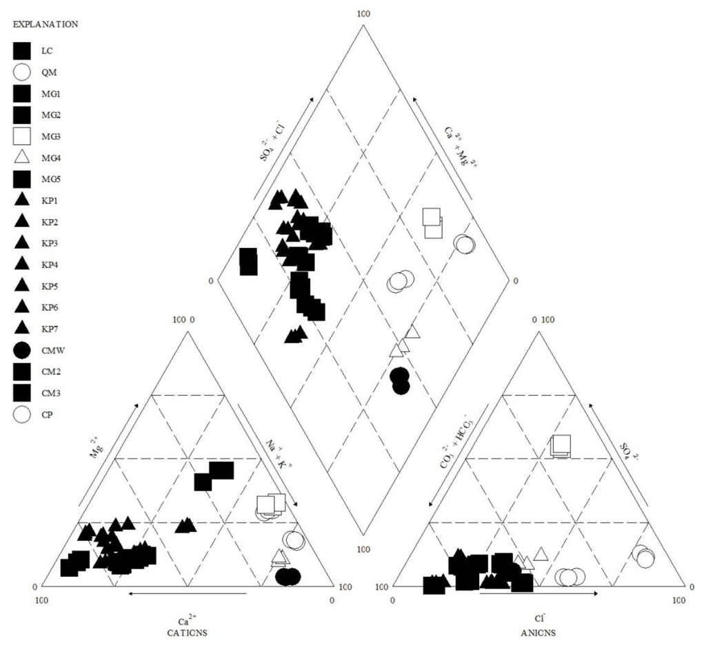 - Piper, A.M. A Graphic Procedure in the Geochemical Interpretation of Water Analysis; U.S. Department of the Interior, Geological Survey, Water Resources Division, Ground Water Branch: Washington, DC, USA, 1953.