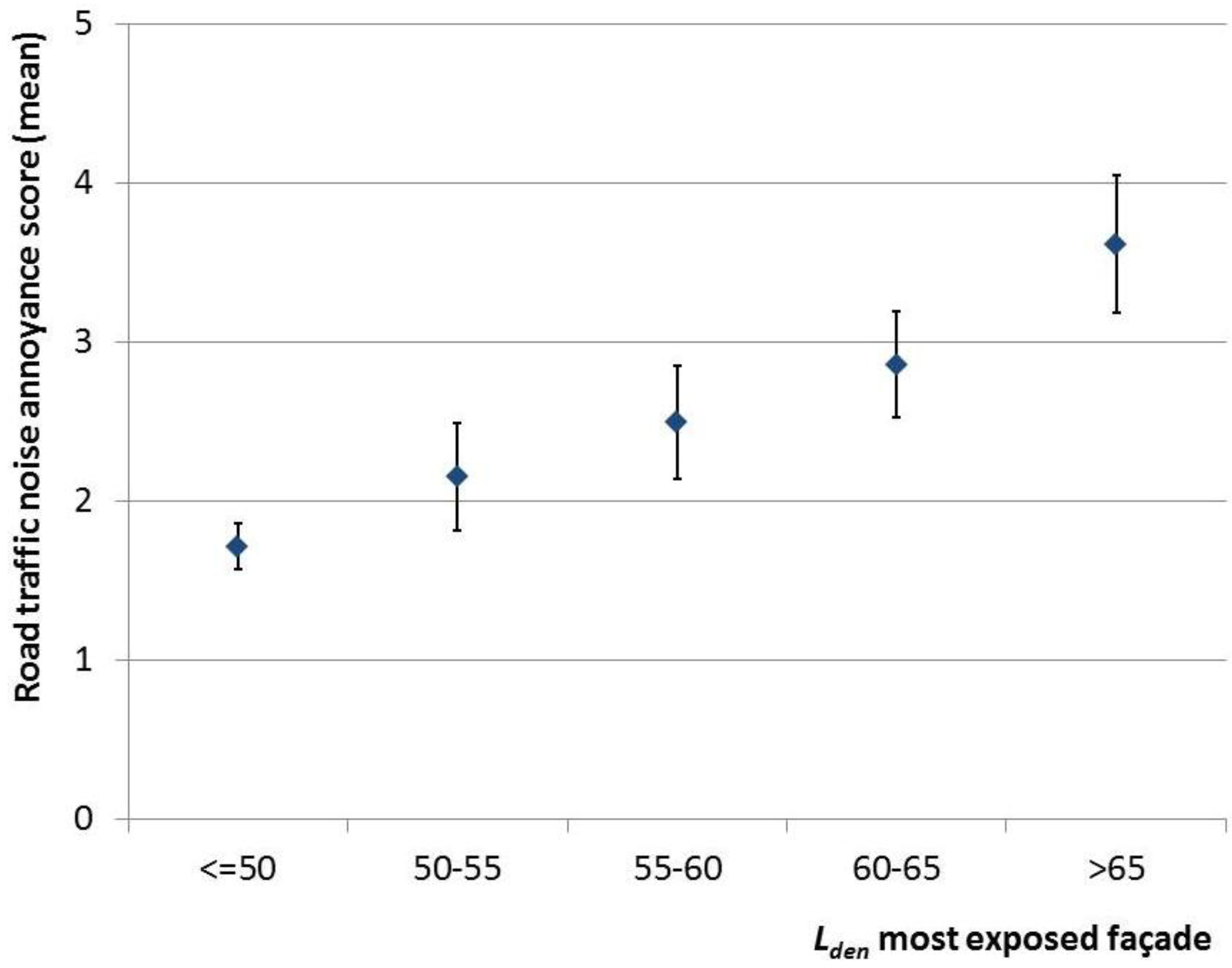 Table 1 shows the characteristics of the Amsterdam study population. The average age of the study population is approximately 36. Relatively more women than men participated in the study, and the percentage of subjects with high education level is comparatively high with slightly over 50%. The average reported road traffic noise annoyance score (scale 0 to 10) in the Amsterdam study population is approximately 2. The average annoyance from neighbor noise exceeds this average with a mean score of approximately 3. Figure 1 shows the mean road traffic noise annoyance score, for categories of Lden,most with confidence intervals, for the Amsterdam study population.