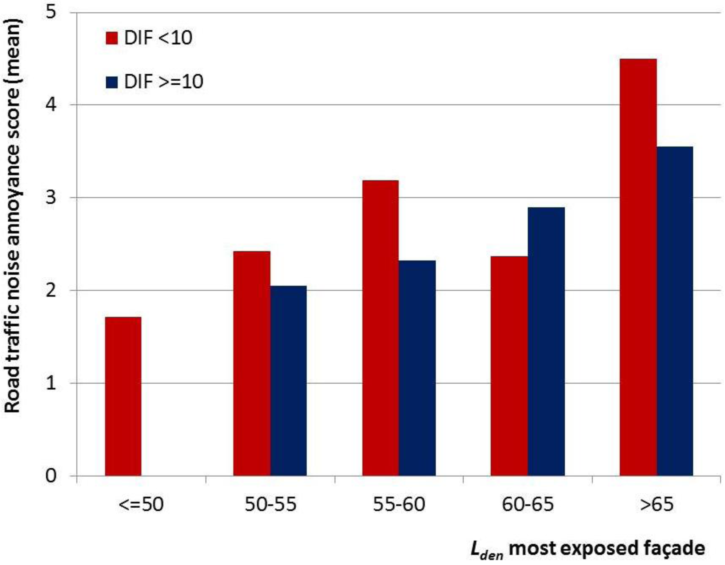 Figure 2 presents the mean annoyance score for the subgroup with a relatively low difference between most and least exposed façade (DIF < 10 dB) and the subgroup with a relatively high difference between most and least exposed façade (DIF ≥ 10 dB), by most exposed façade road traffic noise level (Lden,most). The figure suggests the mean annoyance scores are lower for the subgroup with a relatively quiet façade, although not consistently for all categories of Lden,most.