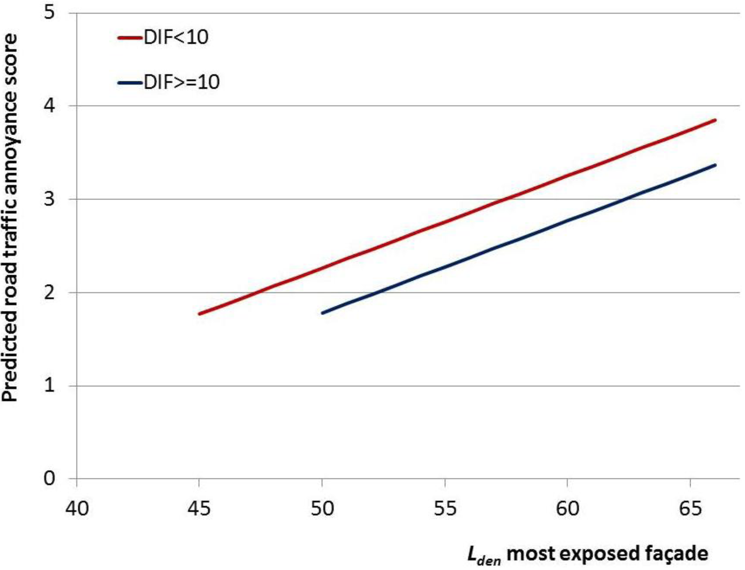In Figure 3 regression lines are shown for the two subgroups of most and least exposed façade exposure difference (DIF < 10 dB versus DIF ≥ 10 dB), for the full model. Results are visualized for the assumption of equal gender distribution, average age, most prevalent education level, and average annoyance score from neighbor noise and humming noise (e.g., fans). The parameter B estimate for Lden,most determines the slope of the regression line, while the parameter B estimate for the difference determines the additional change in annoyance score related to this difference. The horizontal shift in the regression lines, which can be read from the figure by looking at equal annoyance scores, provides an estimate of the difference in “effective noise level” between these two groups. The figure shows that the horizontal shift in the regression lines approximates 5 dB, Lden,most.