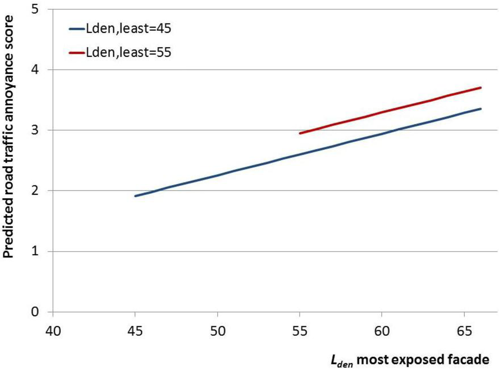 In Figure 4, the regression lines are visualized for various levels of Lden,least, for the full model. The results indicate that for the predicted annoyance score a reduction of 1 dB at the least exposed façade corresponds to a reduction of approximately 0.5 dB at the most exposed façade (i.e., a 5 dB horizontal shift (Lden,most) in regression lines corresponds to a 10 dB change in Lden,least (e.g., from Lden,least 45 dB to Lden,least 55 dB)).