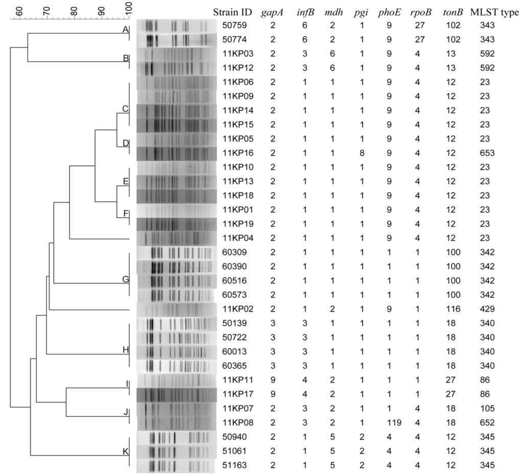 PFGE distinguished the 32 strains into 13 patterns, whereas 11 types were obtained by MLST. Overall, the cluster results of PFGE and MLST have high concordance. The strains had same PFGE patterns also have same (Groups A, B, C, E, F, G, H, I and K in Figure 5) or similar (Groups D and J in Figure 5) MLST types. All the strains belonging to same MLST types had same PFGE patterns except that of ST23. The strains belonging to ST23 were divided into five different PFGE types (Groups C, D, E, F and strain 11KP04).