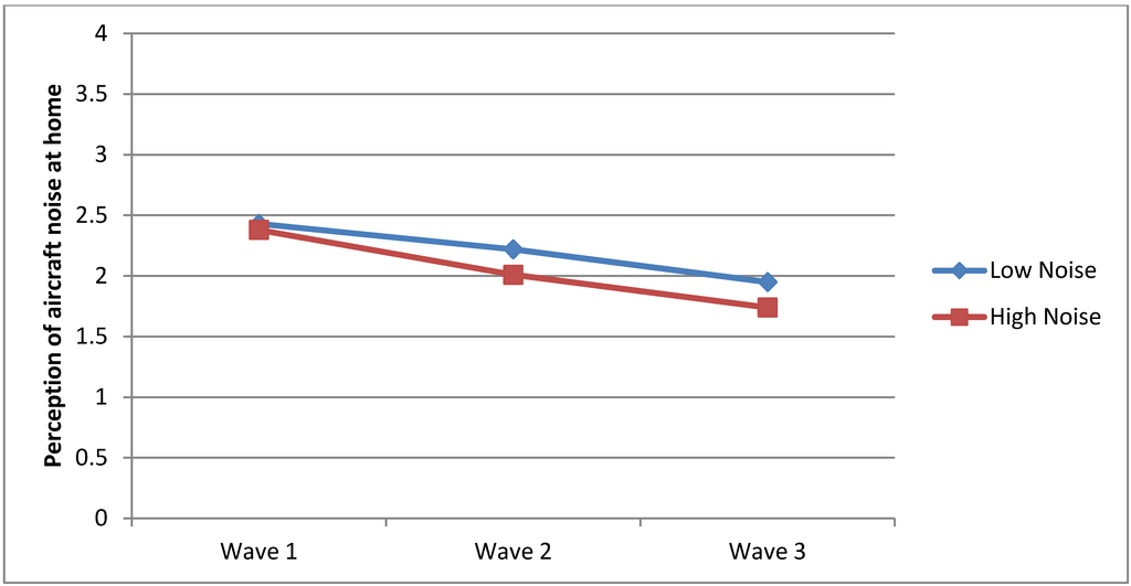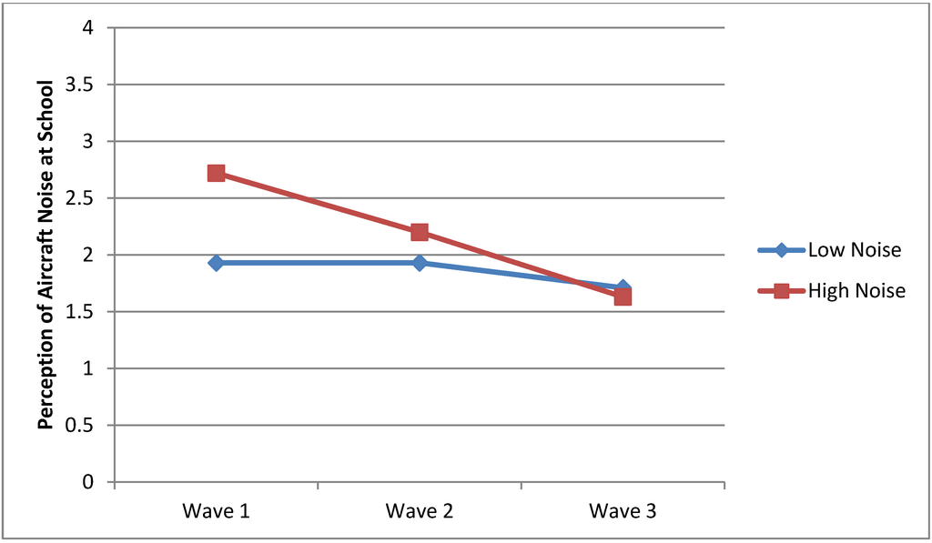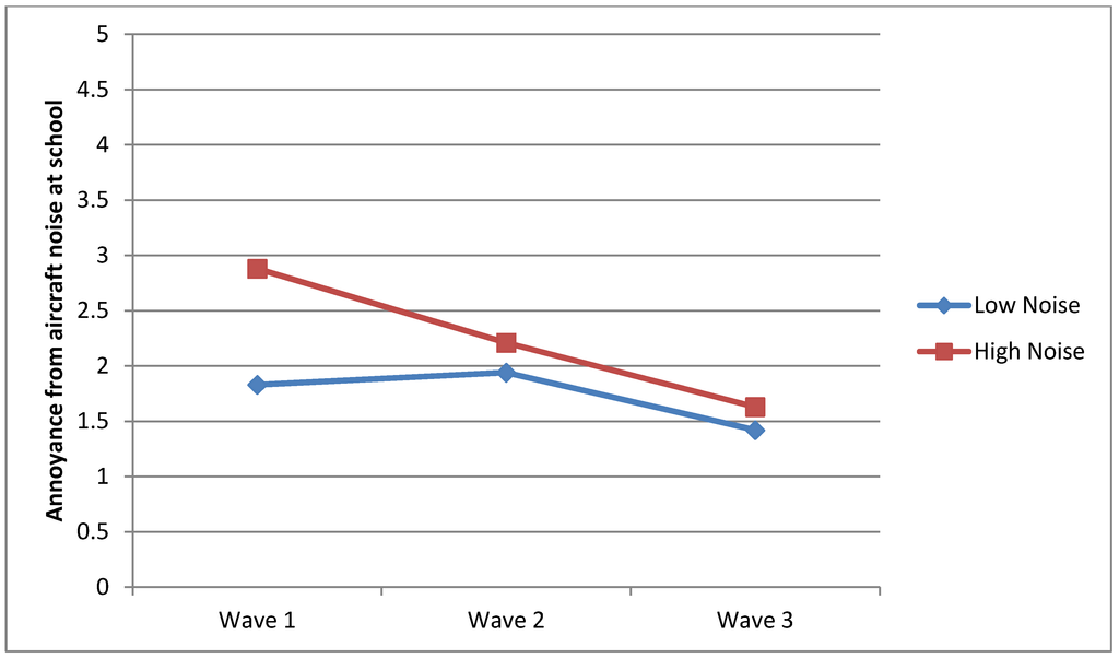 The results showed that the general health of the LN children was poor at Wave 1. This result is unfathomable especially because efforts were made during the conceptualization and piloting phase to ensure that children in the HN and LN were from similar socio-economic and health backgrounds. It is further surprising that their health was relatively poor only at Wave 1 and yet they were not exposed to aircraft noise. It seems that other factors (e.g., air pollution, noise pollution from road traffic, construction, and so on) beyond the scope of this study may have been responsible for these results.