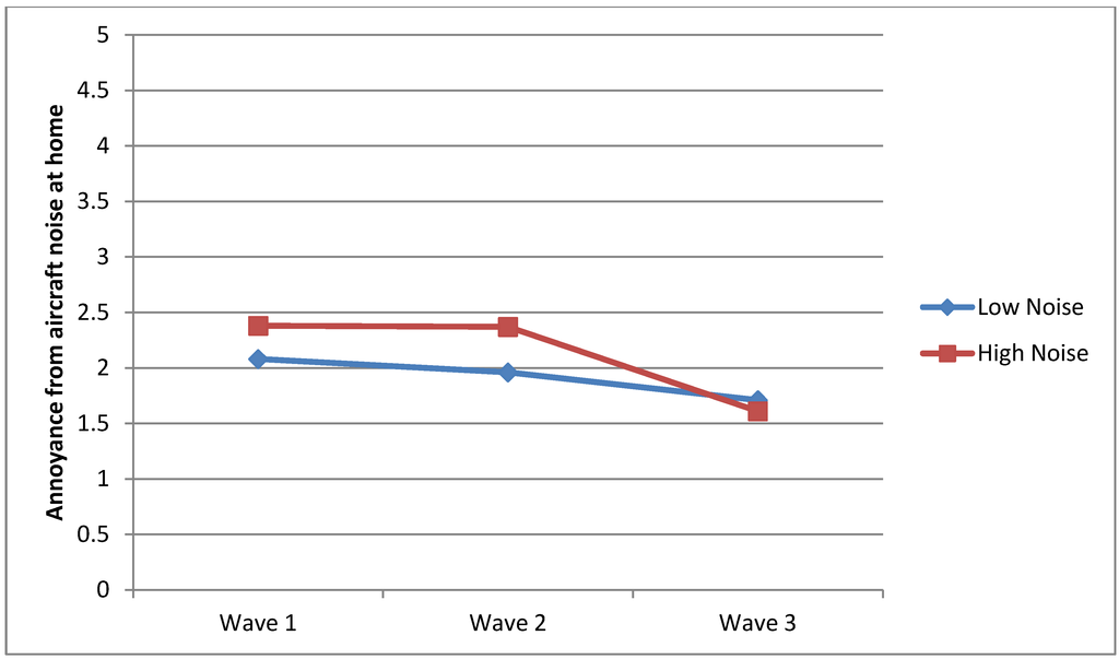 Question Two also investigated whether there was a significant difference between the HN and LN groups in the annoyance reaction from aircraft noise exposure at home throughout all the waves. As presented in Table 2, the HN group demonstrated significantly greater scores than the LN group on annoyance reactions from aircraft noise in Wave 1 (F1, 732 = 16.43, p = 0.00) and in Wave 2 (F1, 649 = 24.18, p = 0.00). No significant effects were observed in Wave 3 (F1, 174 = 0.43, p = 0.50). The presence of interaction effects are illustrated in Figure 6.
