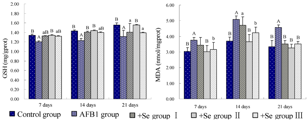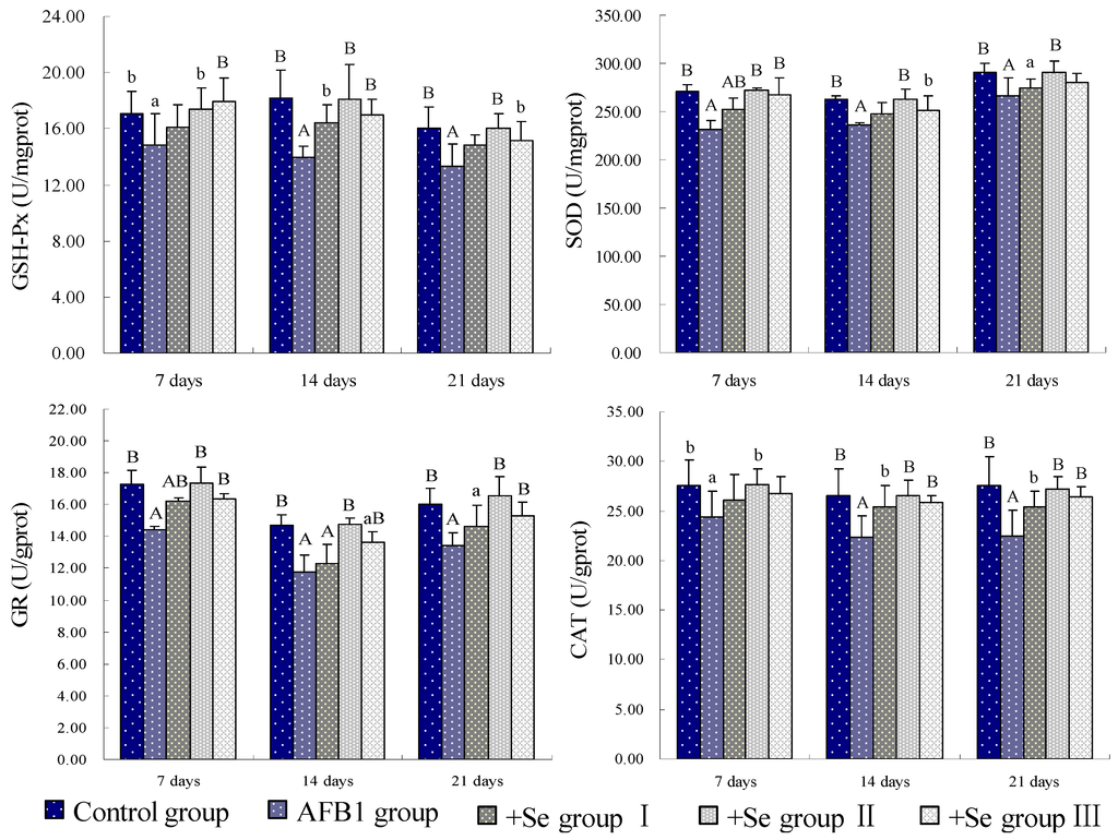 Compared with the control group, the GSH contents of spleen were significantly decreased (p < 0.01) in the AFB1 group. However, when compared with those in the AFB1 group, the GSH contents of spleen were increased in three +Se groups, especially in the +Se group II, from 7 to 21 days of age. At the same time, the MDA contents were higher in AFB1 group than those in control group (p < 0.01), while those were lower in three +Se groups than those in AFB1 group, especially in +Se group II (Figure 1). As shown in Figure 2, the activities of GSH-Px, SOD, GR and CAT were all decreased (p < 0.01 or p < 0.05) in the AFB1 group when compared with those in control group from 7 to 21 days of age. However, the activities of GSH-Px, SOD, GR and CAT showed an increase in three +Se groups when compared with those in AFB1 group, especially in +Se group II.