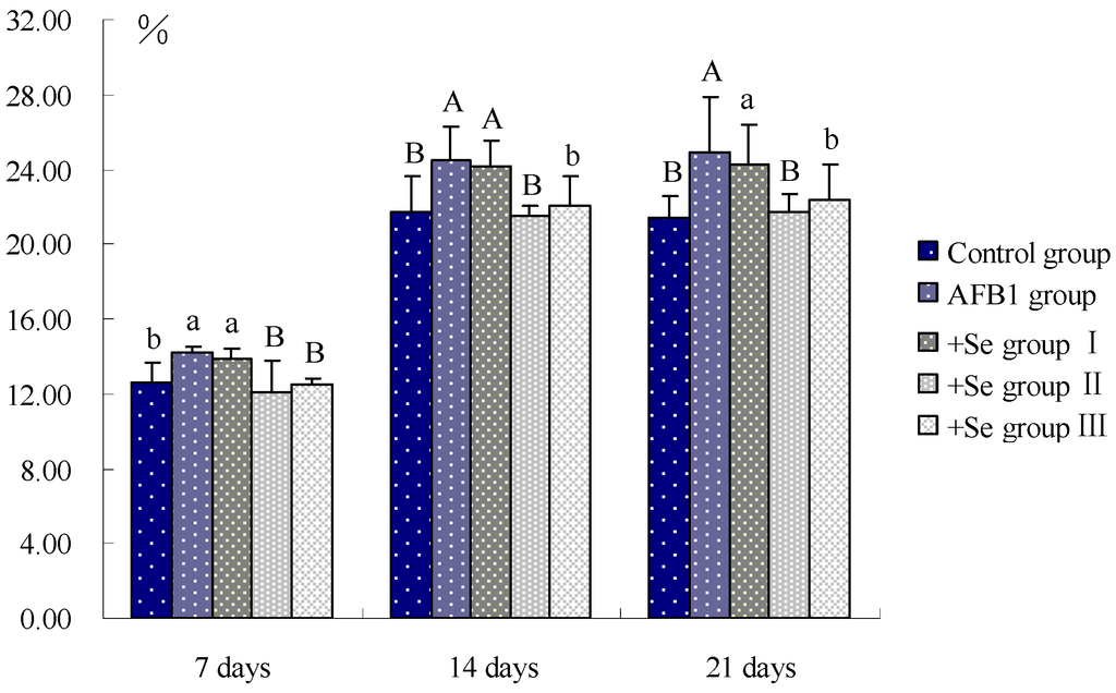 As shown in Figure 3, the percentage of apoptotic splenocytes was increased (p < 0.05) in the AFB1 group at 7 days of age and significantly increased (p < 0.01) at 14 and 21 days of age, when compared with that in control group. However, compared with that in AFB1 group, the percentages of apoptotic splenocytes were decreased (p < 0.05) in three +Se groups, and significantly decreased (p < 0.01) in +Se group II.