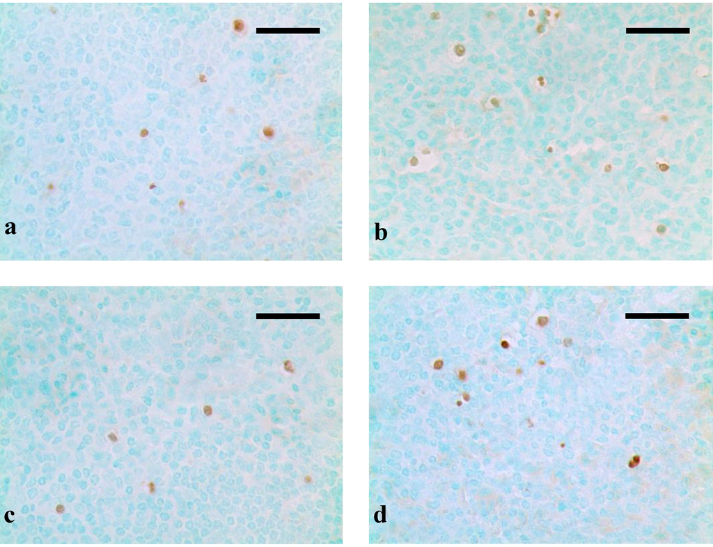 The DNA fragmentation indicative of apoptosis was examined using terminal deoxynucleotidyl transferase-mediated dUTP nick end labeling method (TUNEL), that could detect early stage apoptosis and examine the topographic distribution of apoptotic cells []. At 7, 14 and 21 days of the experiment, six chickens in each group were euthanized and spleens were sampled and fixed in 4% paraformaldehyde and routinely processed in paraffin. Thin sections (5 ìm) of each tissue were sliced from each block and mounted on glass. Slides were stained with TUNEL assay, which was performed using apoptosis detection kit (Merck, New York, Germany, QIA33) according to the manufacturer’s instructions, as described by Peng et al. [].