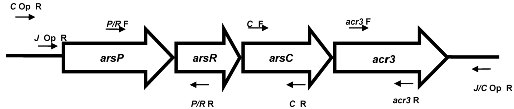 Although the arsenic resistance operon is found mostly in Gram negative organisms, it has been found in Gram positive organisms as well, and is thought to originate from Gram positive bacteria [,]. The arsenic resistance determinants can be found in the chromosome as in the case of Escherichia coli or on transmissible plasmids as in the case of Staphylococcus aureus [,,]. Generally, arsenic resistance operons contain three to five genes [,]. The 3-gene system found on E. coli and P. aeruginosa chromosomes and on S. aureus plasmids contains arsR (transcriptional repressor), arsB (arsenite permease), and arsC (arsenate reductase) [,,]. The 5-gene system found on E. coli plasmids and A. multivorum plasmids contains arsR (arsenite inducible repressor), arsD (negative regulatory protein), arsA (ATPase), arsB (asenite efflux pump), and arsC (arsenate reductase) which converts As (V) to As (III) []. A 4-gene system is also available such as the one found in Campylobacter jejuni, Campylobacter lari, B. subtilis, S. marsecens, and T. ferrooxidans [,,,,]. The Campylobacter jejuni arsenic resistance operon has been sequenced and shown to contain two to four genes []. The four genes that have been identified are arsR (a transcriptional repressor), arsP (a putative membrane permease), arsC (an arsenate reductase), and acr3 (an efflux protein).