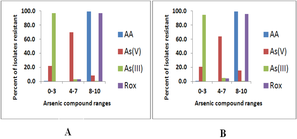 Studies on arsenic resistance in Campylobacter species are limited in the literature [,,]. In this study, a total of 552 Campylobacter isolates (281 Campylobacter jejuni and 271 Campylobacter coli) isolated from retail meat samples were subjected to arsenic resistance profiling using the agar dilution method to the following arsenic compounds: arsanilic acid (4–2,048 μg/mL), roxarsone (4–2,048 μg/mL), arsenate (16–8,192 μg/mL) and arsenite (4–2,048 μg/mL). The 10 different concentrations tested for each arsenic compound is listed in details in Table 1. The isolates were from chicken (n = 130), turkey (n = 19), pork (n = 6), beef livers (n = 102), chicken livers (n = 272), and chicken gizzards (n = 23). As shown in Table 2, most of the 552 Campylobacter isolates were able to survive at higher concentrations of arsanilic acid (512–2,048 μg/mL), roxarsone (512–2,048 μg/mL), medium concentrations of arsenate (128–1,024 μg/mL), but at lower concentrations for arsenite (4–16 μg/mL). It is apparent from the results above that the Campylobacter isolates screened in this study have a higher resistance to the organoarsenicals that is known to be used in production animal feeds (arsanilic acid and roxarsone). Using these compounds in feed can cause a selective pressure towards more resistant Campylobacter isolates. The isolates were not highly resistant to arsenite which is the most toxic by-product of the organoarsenicals. The high rates of resistance observed here are of some concern since it might be an indication of an extensive use of arsenic in the feed and raises a concern about the levels of this heavy metal in the retail meat consumed. The concern that retail meat products accumulate enough arsenical compounds that they may become carcinogenic and potentially affecting human health cannot be eliminated []. We hope that the voluntary stoppage of the sale of roxarsone by Alpharma will decrease such a risk to human health []. It is worth mentioning that our meat samples were collected before this voluntary stoppage of the sale of roxarsone.