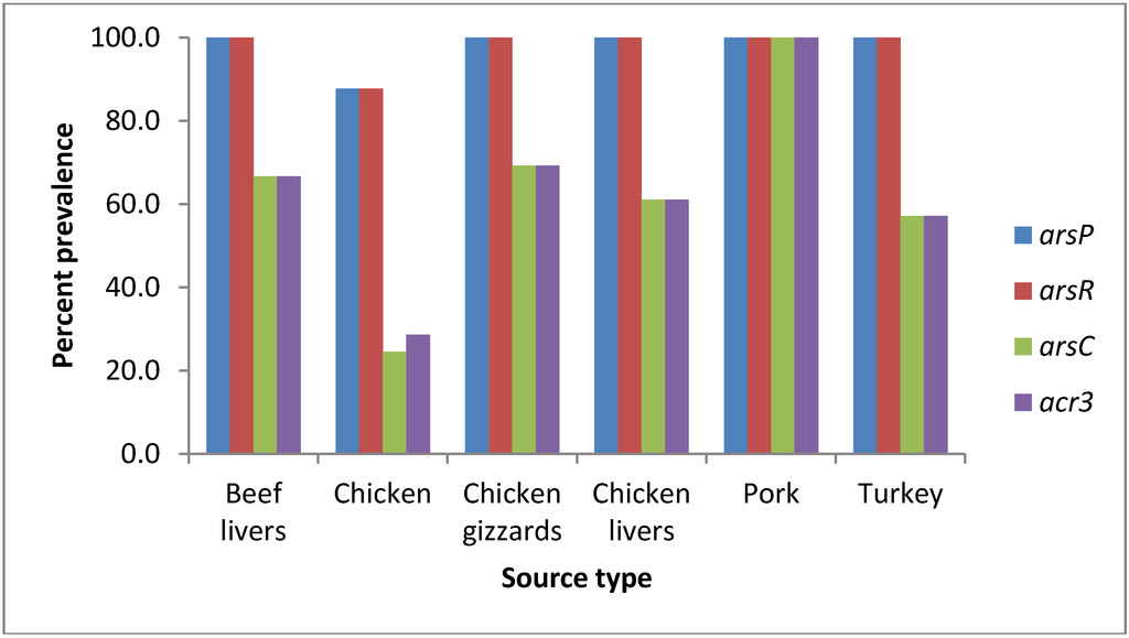 As shown in Table 4, the presence of arsC and acr3 (large operon) appears to be more prevalent in Campylobacter coli than Campylobacter jejuni isolates rather than in a particular meat source. Within the Campylobacter jejuni isolates the prevalence of arsC and acr3 was higher in turkey 60% (3/5), and chicken gizzards 60% (6/10) isolates (Table 4) compared to the average prevalence of these two genes (14.9% and 17.5%) from all meat sources tested (Table 3). As shown in Figure 3 and Table 4 and if not taking the species into consideration, the prevalence of arsC and acr3 (large operon) appears to be higher in the pork isolates (100%) followed by chicken gizzards (69%), beef livers (67%), chicken livers (61%), turkey (57%), and finally chicken (29%).
