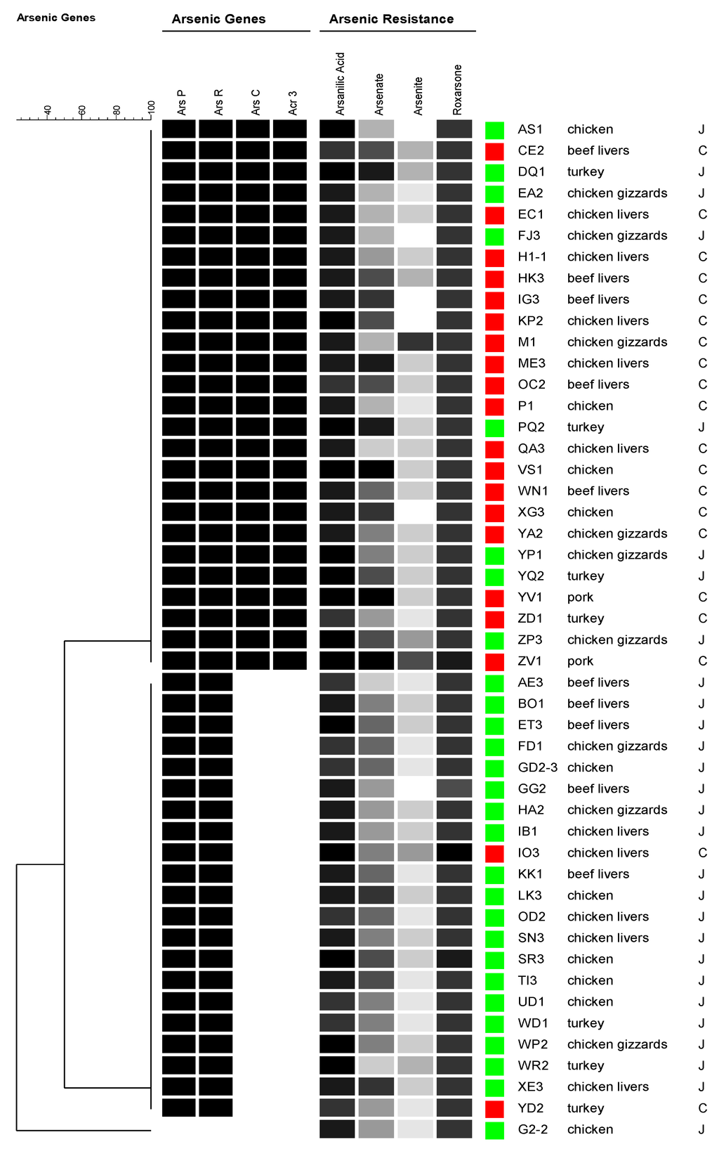 As shown in Figure 1, arsenic resistance in Campylobacter is controlled by a four gene operon. ArsR is actually a negative regulator that binds to the promoter region of the operon and represses the transcription. Arsenite is believed to abolish the binding of arsR to the promoter region and transcription will occur []. In our study, the presence of arsC and acr3 genes in the large operon did not appear to significantly increase Campylobacter resistance to the tested arsenic compound (data not shown). The only noticeable difference was in regards to arsenate resistance where the only isolates that were able to grow at (4,096–8,192 μg/mL) were those harboring the arsC and acr3 genes regardless of the Campylobacter species. So, having four genes did not seem to increase the resistance to arsenic compounds when compared to the isolates with two genes, except for allowing some isolates to resist higher arsenate concentrations. Having the arsC (an arsenate reductase) in the larger arsenic resistance operon might have a role in conferring such a higher resistance to arsenate. This can also explain our results above where the only noticeable difference between the two tested Campylobacter species was that 15.5% of the Campylobacter coli isolates were resistant to higher concentrations of arsenate (2,048–80,192 μg/mL) where only 8.5% of Campylobacter jejuni isolates were resistant to the same concentration range. The higher number of Campylobacter coli isolates resistance to high arsenate concentrations might be due to the fact that the majority of Campylobacter coli isolates harbor the larger arsenic resistance operon that carry the arsenate reductase gene (arsC). Our finding is consistent with a previous study where they noticed that the presence of arsC and acr3 caused an increase in the resistance of the Campylobacter jejuni strains to arsenate and arsenite, even though they tested only 27 isolates in their study []. As shown in Figure 4, it is clear from the dendrogram that the presence of the four gene operon did not significantly increase arsenic resistance with the exception of arsenate where some isolates showed resistance to higher concentrations to this compound indicated by darker boxes in the figure which support our discussion above regarding resistance to arsenate. Most of the turkey Campylobacter jejuni strains harboring the large operon showed higher resistance to arsenate (Figure 4). The presence of arsB did not seem to increase resistance to any of the four tested arsenic compound by Campylobacter jejuni isolates in our study (Data not shown) since it was present in 98% of those isolates despite their slight resistance variation. The complete absence of arsB from any of the screened Campylobacter coli isolates is very interesting. To rule out the possibility of using a non-specific primer, the published DNA sequence for arsB from Campylobacter jejuni was blasted against the Genbank database including microbial genomes and no homology was found to this gene in any Campylobacter coli genome sequence. This can encourage us to suggest that there are still other possible unexplored mechanisms in conferring arsenic resistance to Campylobacter. A possible role of the CmeABC efflux pump in this regard is currently under investigation in our laboratory.