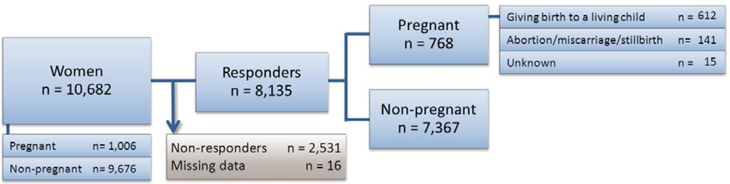 Patient flow. Distribution of women included in the study population according to the follow-up response and pregnancy status. Women 15–54 years of age that were attending the GSP in Denmark between 2006–2012 and attending follow up were included in this study. The non-responders included 2,547 (23.8%) women that were lost to follow up.