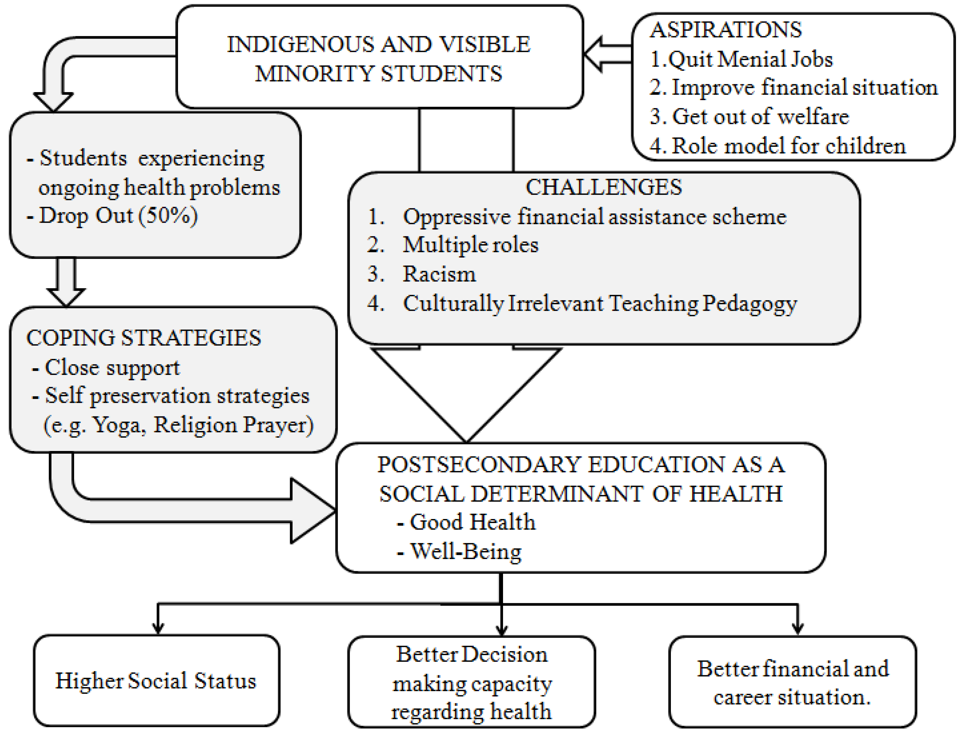 The level of educational attainment is increasingly being recognized as an important social determinant of health. While higher educational attainment can play a significant role in shaping employment opportunities, it can also increase the capacity for better decision making regarding one’s health, and provide scope for increasing social and personal resources that are vital for physical and mental health. In today’s highly globalized knowledge based society postsecondary education (PSE) is fast becoming a minimum requirement for securing employment that can afford young adults the economic, social and personal resources needed for better health. Canada ranks high among OECD countries in terms of advanced education, with 66% of Canadians having completed some form of postsecondary education. Yet youth from low income indigenous and visible minority (LIIVM) backgrounds continue to be poorly represented at PSE levels. The current study aimed to understand the reasons for this poor representation by examining the experiences of LIIVM students enrolled in a postsecondary program. Findings show that the challenges they faced during the course of their study had an adverse impact on their health and that improving representation of these students in PSE will require changes at many levels.