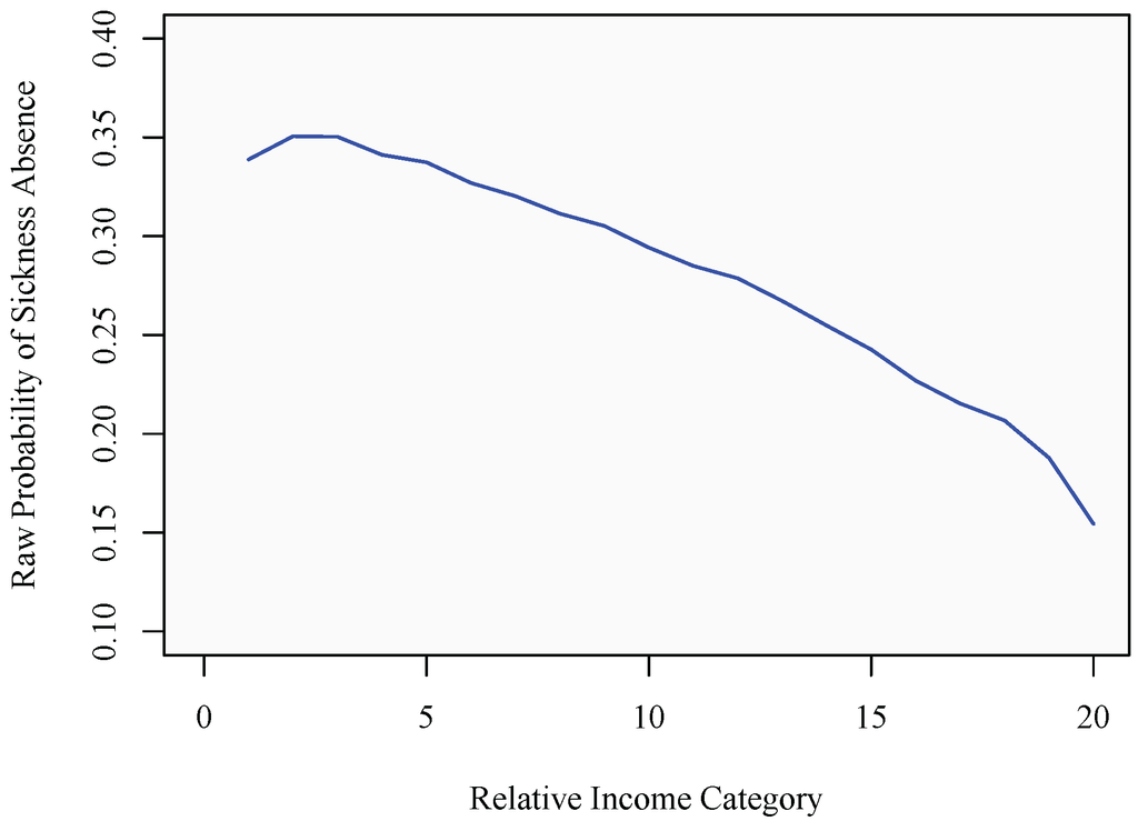 One empirical contribution of this article pertains to the use of duration analysis in investigating the mechanisms underlying the relationship existing between an individual’s labor market performance and the propensity for sickness absence. Figure 1 tentatively indicates the existence of such a relationship, where relatively deprived individuals, on average, display a considerably higher raw probability of sickness absence. Evidently, there are several potential explanations to an individual’s position in the relative income distribution. To the extent that one’s position in the relative income distribution is synonymous with increased work-related stress and general discontent with one’s situation, this could possibly have adverse health consequences, thereby explaining the observed pattern. However, the greater propensity of sickness absence among the lowest performing individuals could also be linked to a greater incidence of shirking.