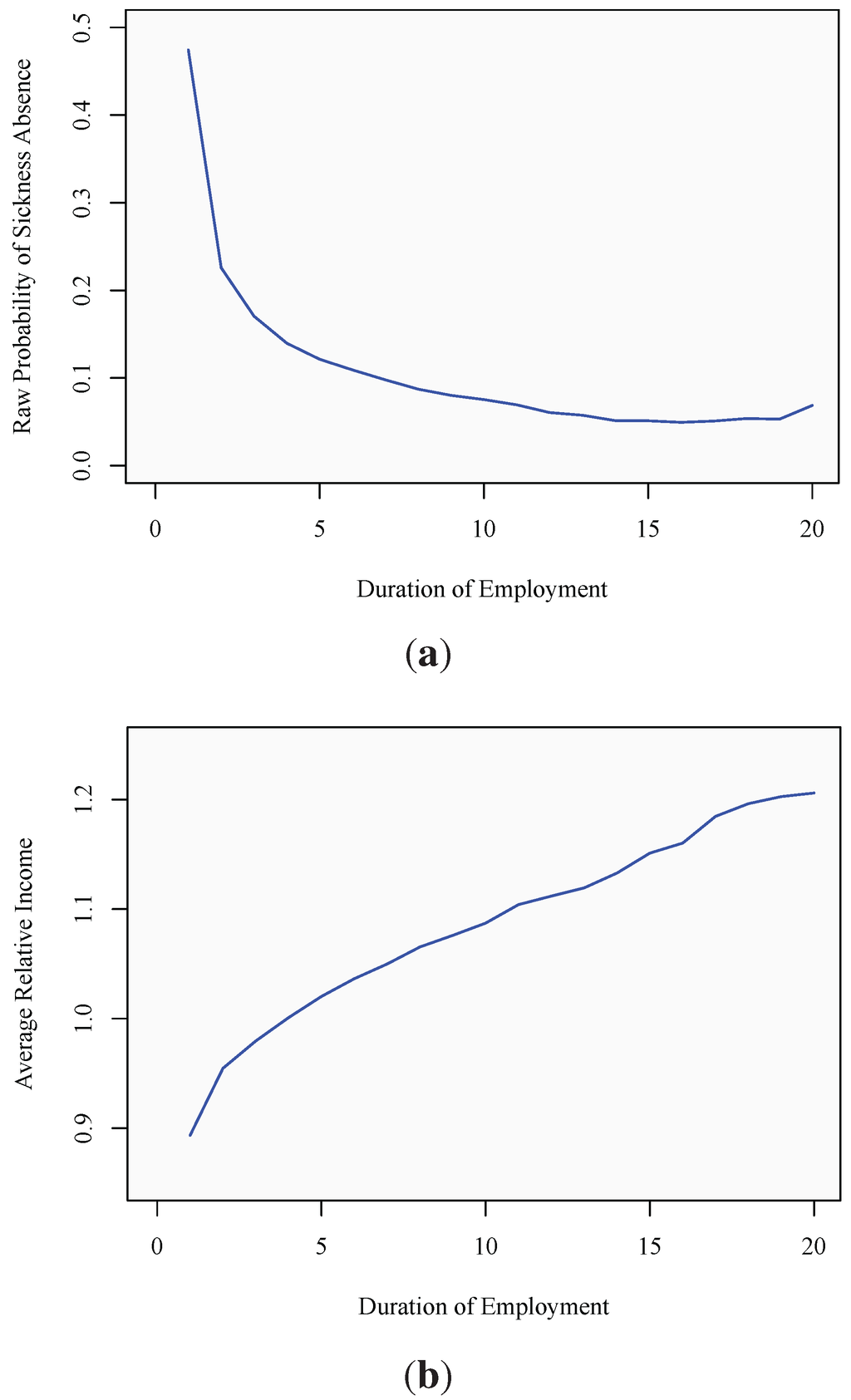 In order to properly identify the influence from relative income on the sickness absence propensity, it is important to recognize the mechanisms generating the individual’s position in the relative income hierarchy. More specifically, it is possible that sickness absence propensity and relative income attainment are jointly determined by some third factor. In illustrating this possibility, panel (a) in Figure 2 displays the unconditional relationship between the duration of an employment spell and the raw propensity to become absent due to sickness. As is evident, the propensity of sickness absence decreases with the duration of the employment spell, suggesting that incidences of sickness absence are recurrent and, thereby, negatively affecting the duration of employment spells among individuals with a higher propensity to be sick. Turning to panel (b), additional evidence is provided for the importance of taking the duration of employment spells into account. Individuals enjoying longer uninterrupted spells of employment on average also perform better in terms of relative income attainment, likely to be due to being positioned on a more favorable career trajectory. As a consequence, the negative relationship between income and sickness absence could therefore, at least partly, result from individuals who are disproportionately allocated to shorter durations of employment being characterized by certain characteristics.