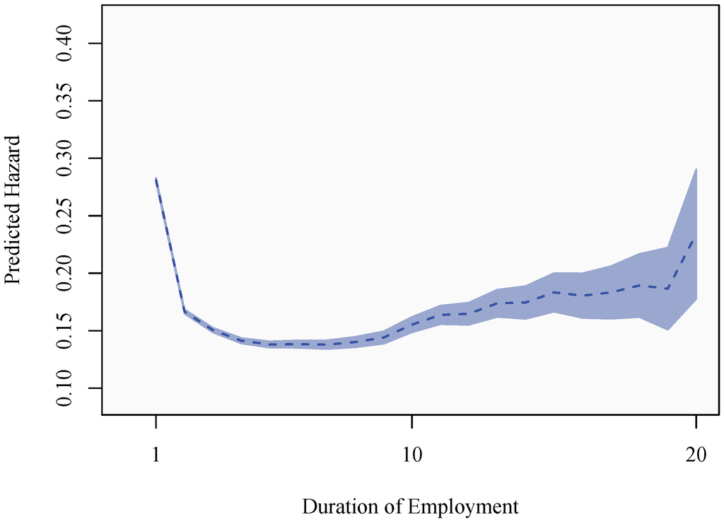 The estimates for the duration dummies (available upon request) indicate a rapidly decreasing probability of sickness absence as the duration of the employment spell increases, until approximately seven years of uninterrupted employment. Past this point, the sickness absence risk gradually increases, yet never reaching the baseline risk experienced during the first year (reference category) of the employment spell. Figure 3 shows the estimated hazard rate (and point-wise 95% confidence intervals) as a function of duration when all explanatory variables are kept constant at their overall means, and only the effect of duration changes. Unlike the raw probability of becoming absent due to sickness depicted in Figure 2, the estimated hazard does not decrease monotonically with duration, but exhibits a roughly u-shaped form. This indicates that the negative effect of duration on the raw hazard can be partly explained by the explanatory variables included in the regression model. In particular, the relative income, which increases with duration and has a negative impact on the hazard, captures a substantial part of the duration dependence. The remaining variations in the hazard function shown in Figure 3 can be interpreted as the effects of unobserved temporal heterogeneity, i.e., effects that vary with duration and are not captured by the covariates included in the regression.