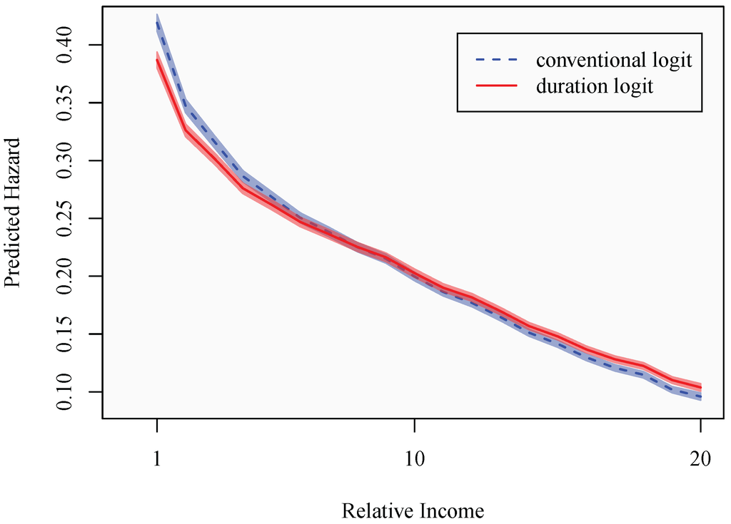 Figure 4 confirms this, showing predicted hazards as mean of covariates, as well as point-wise confidence intervals, only manipulating the typical individual’s relative income. The hazards are calculated based on Models 1 and 2, confirming that a failure to account for employment duration produces an exaggerated effect of relative income on the sickness absence hazard. In absolute terms, the bias is particularly accentuated at low relative incomes. This suggests that the conventional (binary choice model) approach over-estimates the influence of relative income on the sickness absence propensity among low performers in the labor market. At the other end of the relative income spectrum, the bias serves to underestimate the influence of relative income in models not controlling for duration. When the effect of duration is accounted for, the sickness absence hazard ranges from 0.39 for the typical individual with the lowest relative income (category 1) to 0.10 for the typical individual with the highest relative income (category 20). This shows that relative deprivation has a substantial effect on the sickness absence propensity, even when the effect of duration is taken into account.