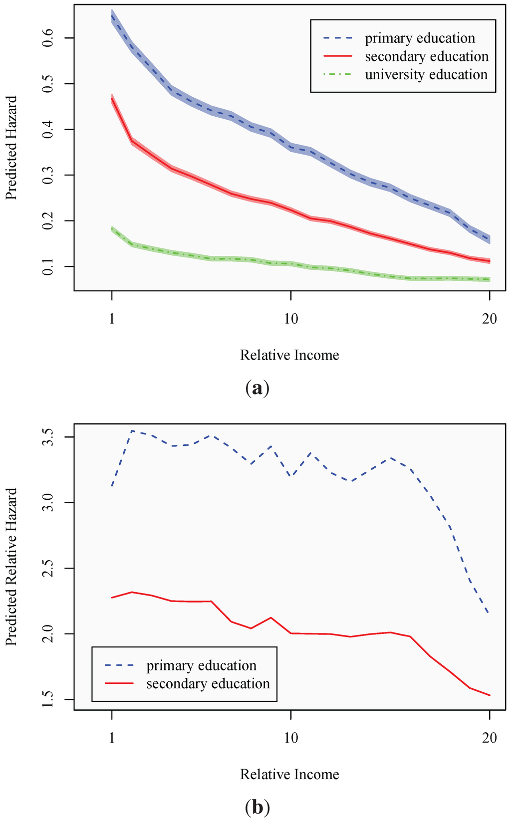 The effect of relative income and education on the sickness absence hazard. (a) Relative income and absolute hazard; (b) relative income and relative hazard.