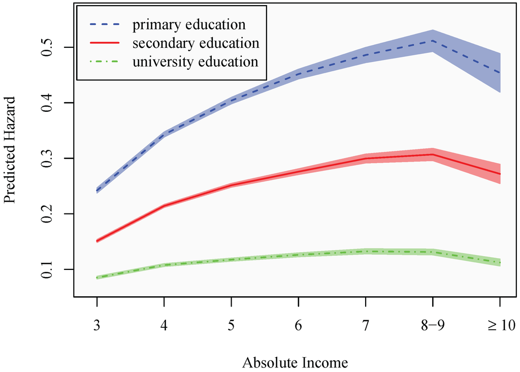 Turning to absolute income attainment, the results indicate quite differing influences on the sickness absence hazard, by educational level. Figure 6 shows predicted sickness absence hazards for different levels of absolute income attainment, again at educational level means. The positive association between absolute income attainment and sickness absence propensity that was previously observed is clearly driven by the primary and, albeit to a considerably lesser extent, secondary school educated. Among the university educated, the influence from the individual’s economic resources is seemingly irrelevant. The pattern could suggest fundamentally different consumption behaviors between the social groups, where increasing economic affluence among, in particular, the primary school educated does little to improve their poorer baseline health. Instead, the increasing economic resources appear to be reinforcing the adverse health behavior that is sometimes suggested in the literature.