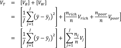 where VB and VW are, respectively, the between-group and within-group variance, yj is the mean health of the jth group, Vrich and Vpoor are, respectively, the variance estimated separately among the rich and among the poor, and nrich and npoor are the numbers of rich and poor individuals in the population. The third equation simply shows that the within-group inequality component may be extended to include J groups, as most environmental justice analyses will consider more than one population group (e.g., multiple racial/ethnic groups, multiple income strata, multiple geographic areas).