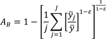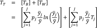 where pi is an individual or group’s population share (which in the case of individual data will be 1/n, so that ∑ pi=1) and yi/y is the ratio of the individual or group i's health to the average health of the population. When the population of individuals is arranged into J groups, the equation is the exact sum of two parts: between-group inequality and a weighted average of within-group inequality: