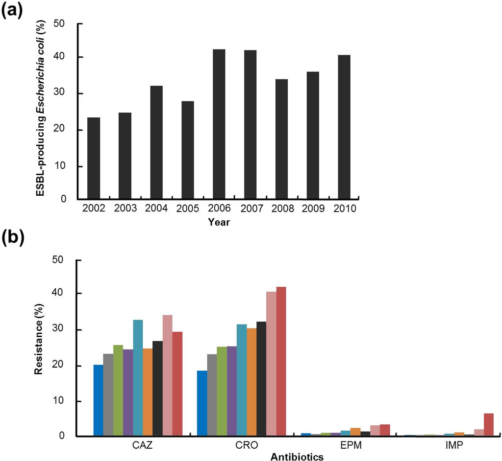 - Ko, W.C.; Hsueh, P.R. Increasing extended-spectrum β-lactamase production and quinolone resistance among Gram-negative Bacilli causing intra-abdominal infections in the Asia/Pacific region: Data from the Smart Study 2002–2006. J. Infect. 2009, 59, 95–103. [Google Scholar] [CrossRef]