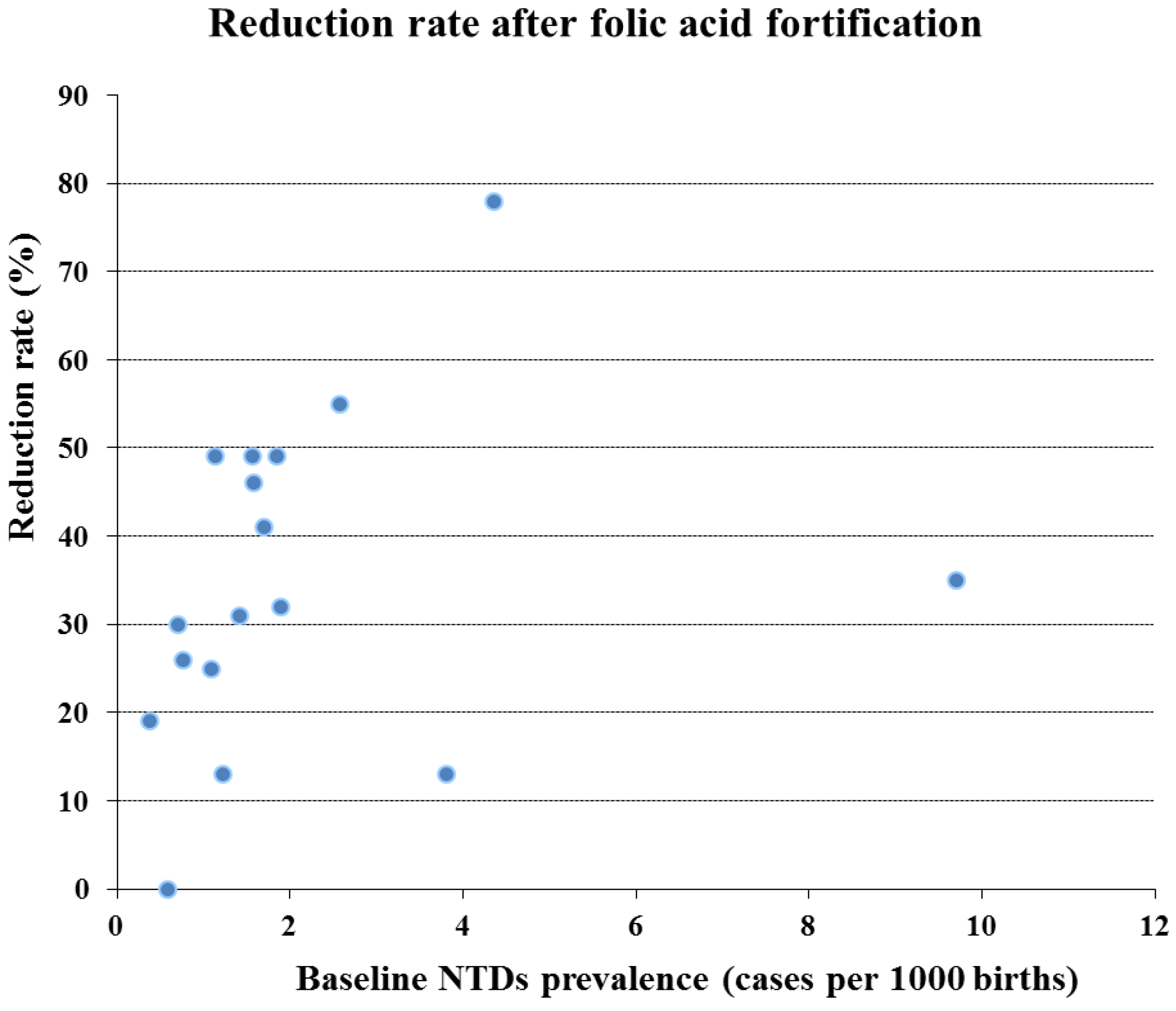 Despite its efficacy, two issues are still a matter of debate regarding food fortification: the appropriate dose to use and potential side effects [89]. Several authors argued that the current amount of FA might be too low to prevent all folic-acid “sensitive” NTDs and favor to increase the FA dose [90,91,92,93]. Their logic is supported by the fact that there seems to be a dose response effect in NTD prevention related to folate supplementation. In fact, NTD rates seem to inversely correlated with the amount of folate intake and/or with maternal RBC and serum folate concentrations [66,94,95,96]. On the other hand, probably not all NTDs cases are sensitive to FA. Reduction of NTDs prevalence after FA food fortification seems to be correlated with NTD baseline prevalence (Figure 2). It remains a challenge to establish whether the number of FA preventable and FA non-preventable NTD cases [97,98]. When Figure 2 is extrapolated it can be deduced that folic acid food fortification will not reduce the number of NTDs below about 0.5 per 1,000 births.