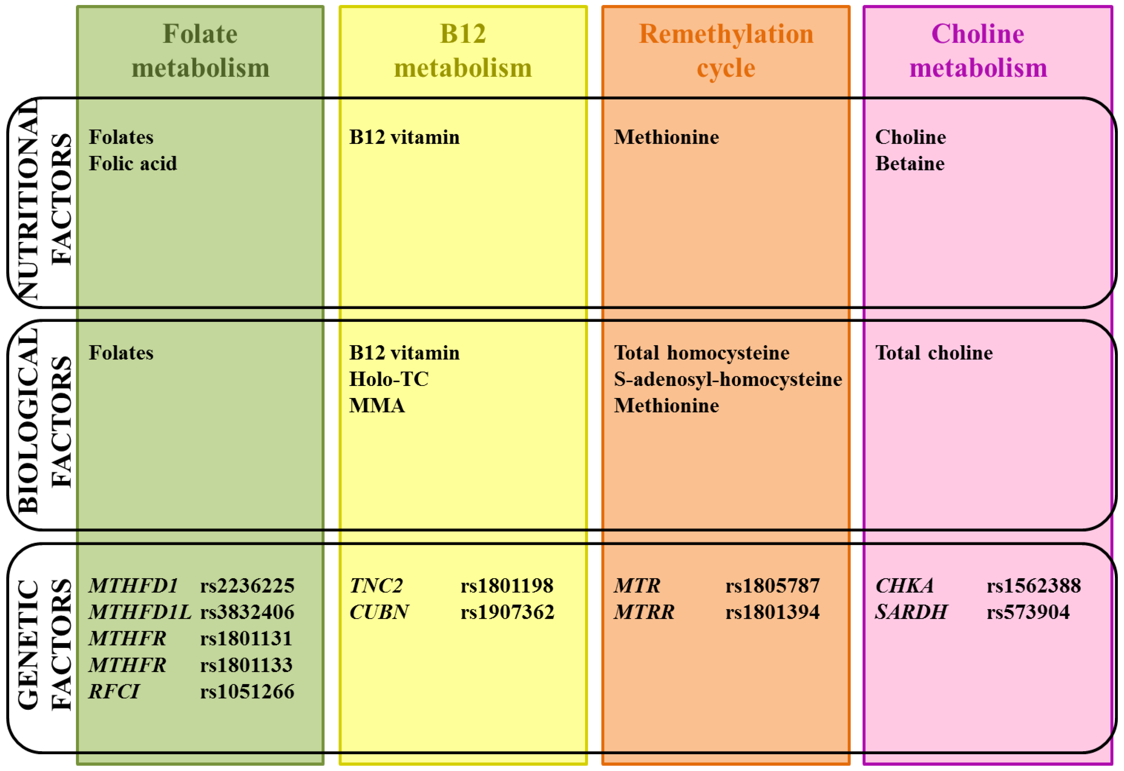 Following the identification of the MTHFR 677C > T variant, many potential polymorphisms in genes involved in folate, remethylation, B12 and choline pathways have been explored in NTDs (Table 2). Only few of them may be associated with NTDs risk: MTHFD11958G > A (rs2236225), MTHFD1L (rs3832406), MTHFR 1298A > C (rs1801131), reduced folate carrier A (RFCI) 80 A > G (rs1051266) MTR 2756 A > G (rs1805087) and MTRR 66A > G (rs1801394).