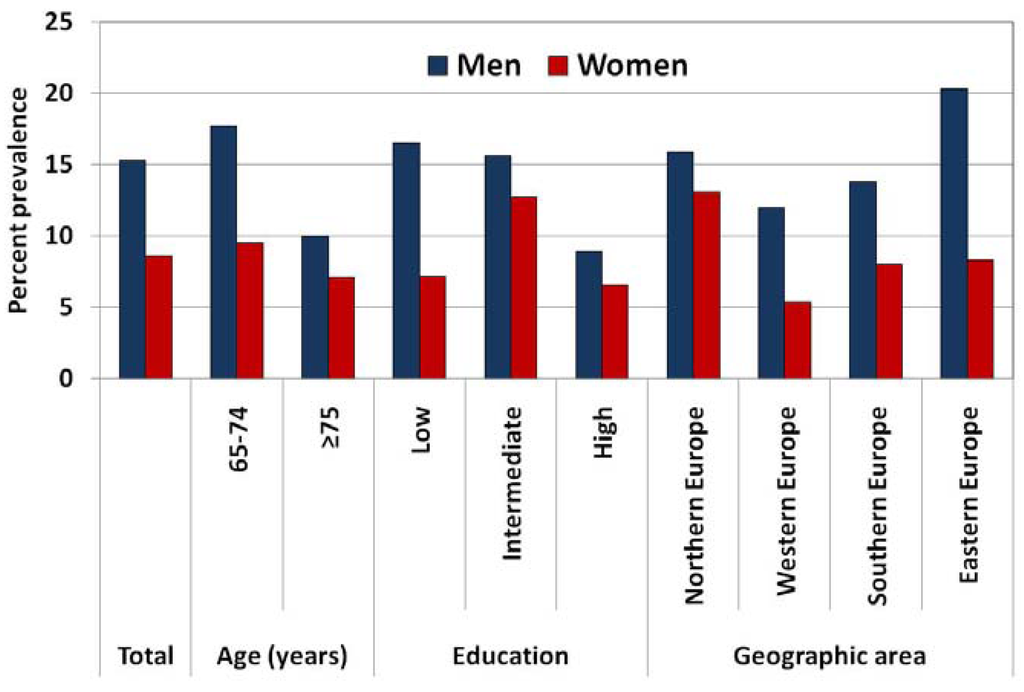 Smoking prevalence was significantly more frequent among Europeans aged 65–74 year (13.4%) than those aged ≥75 years (8.2%) overall and in men, but not in women. In men, age-adjusted smoking prevalence was highest in elderly with low level of education (16.5%) and lowest in those with a high level of education (8.9%; p for trend = 0.015).