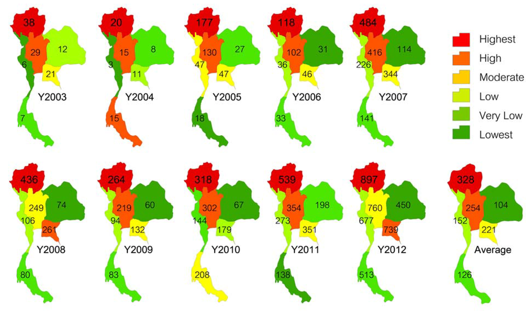 Figure 3b shows the rates of HFMD cases per capita for each year. The annual disease incidence rate was highest in Lampang province, located in the central part of the study area, from 2003 to 2008. The area with the highest incidence rate then moved east to Nan from 2009 to 2011. In 2012, the highest incidence rate was recorded in Mae Hong Son province, located on the western side of the study area.