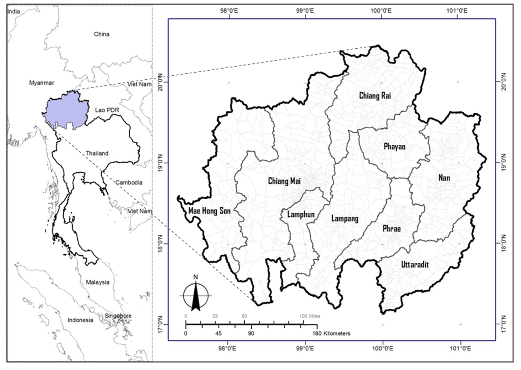 Because the upper northern region of Thailand was the area with the highest HFMD infection rate in Thailand over all 10 years from 2003 to 2012, this area was selected as the study area. Geographically, the upper north of Thailand is one of six regions of Thailand and is located between 97°19′8′′E and 101°22′18′′E and 17°11′12′′N and 20°29′1′′N. The region is located approximately 600 kilometers north of Bangkok, covers an area of 93,690.85 km2 (9,369 million hectares), or 18.25 percent of Thailand, and has a population of 6,133,208. The area consists of nine provinces: Mae Hong Son, Chiang Mai, Chiang Rai, Lamphun, Lampang, Phayao, Phrae, Nan and Uttraradit. It borders the Republic of the Union of Myanmar to the west and north, the Lao PDR to the north and east and is adjacent to the Tak, Sukhothai and Pitsanulok provinces of Thailand to the south (Figure 2).