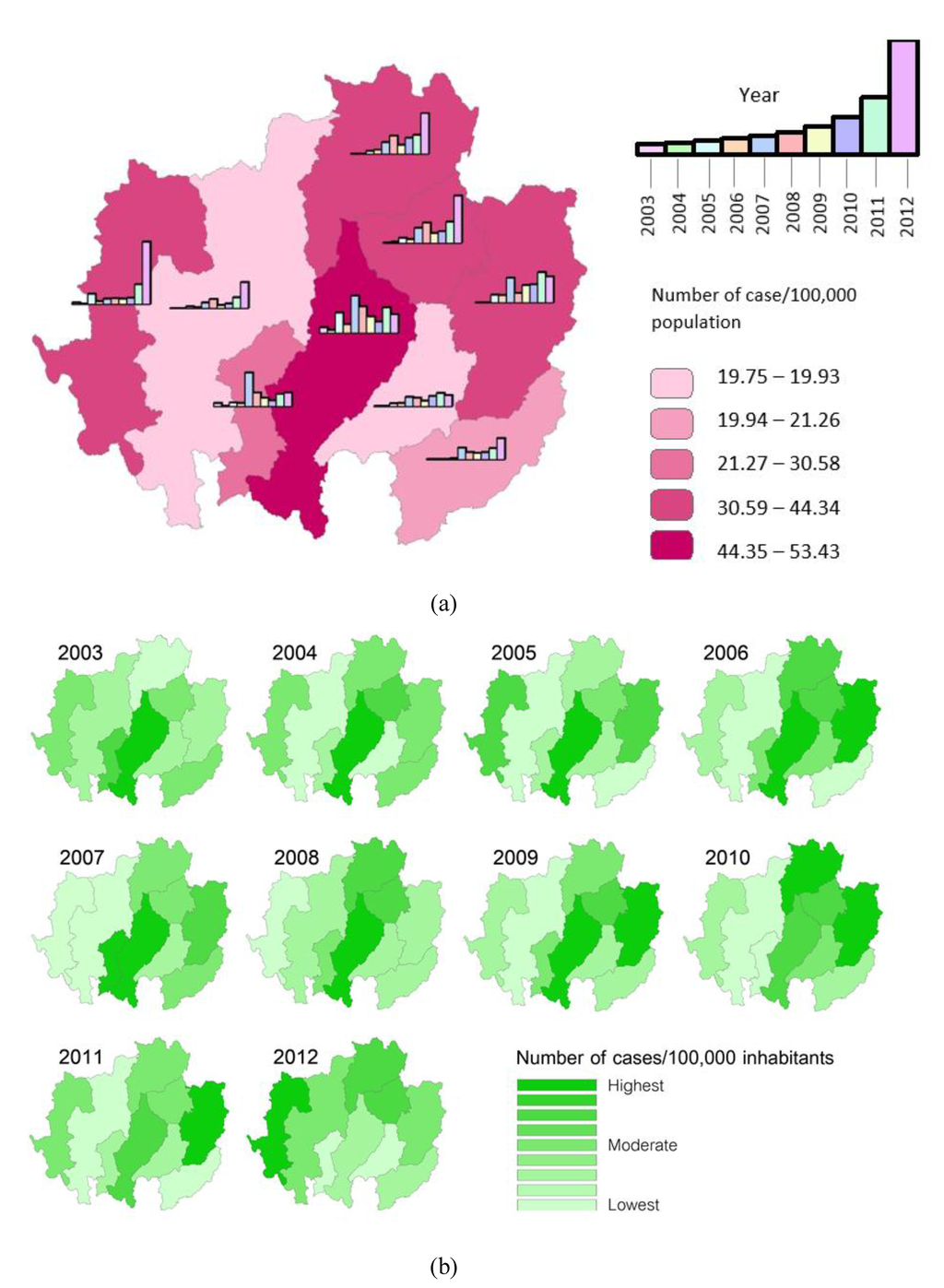The investigation of the temporal distribution of infections in each province from 2003 to 2012 revealed that most maxima in terms of the number of patients occurred in the latter part of the decade, mostly in 2011 and 2012, with the exception of Lamphun and Lampang provinces, where the highest patient case counts occurred in 2007. It is notable that some outbreaks in neighboring areas had similar temporal patterns. In Phrae and Nan, outbreaks occurred during the same period in 2011, and likewise, Chiang Rai and Phayao saw an outbreak peak in 2012 (Figure 3a).