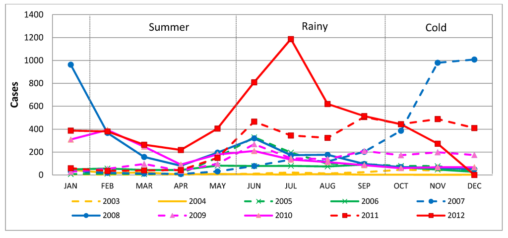 Monthly average temperature (Celsius), monthly total rainfall (millimeters) and monthly relative humidity (percent) for January 2003 to November 2012 were obtained from the nine weather stations operated by the Thai Meteorological Department in each province in the study area. The climate of the upper north of Thailand is subtropical and cooler than the other regions of Thailand. As such, it can be clearly divided into three seasons as follows: summer: February through May; rainy: June through September; and cold: October through January.
