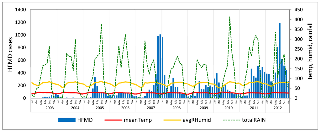 Hand, Foot and Mouth Disease (HFMD) is an emerging illness infecting infants and children. It is characterized by fever, painful sores in the mouth and a rash with blisters on the hands, feet and buttocks. HFMD is most frequently caused by coxsackievirus A16 (CA16) and enterovirus 71 (EV-71) [1,2,3]; however, most patients with fatal complications are infected with EV-71 [4]. At present, no effective chemoprophylaxis or vaccination approaches for dealing with HFMD are available [5,6]. The transmission of HFMD occurs from person to person through direct contact with nasal discharge, saliva or fluid from the blisters. Other infection paths include food or water contaminated with fecal droplets, nasal discharge, fluid or saliva from an infectious person. Weather variables may affect the transmission of HFMD either directly or indirectly [7]. Globally, HFMD outbreaks have been documented for more than four decades. It has been reported that in the last decade the western Pacific region, including countries such as Japan, Malaysia, Singapore, Thailand and China, was the area most severely affected by HFMD [8,9,10,11,12,13]. Other countries, such as Taiwan, Hong Kong, the Republic of Korea, Vietnam, Cambodia, Brunei and Mongolia, were also impacted. HFMD has also progressed to become a leading cause of suffering and mortality in some developing countries, with Thailand finding itself among these. The current epidemic situation in Thailand, as reported by the Bureau of Epidemiology, Ministry of Public Health, includes HFMD outbreaks during the past 10 years, with the more severe in the last 5 to 6 years. Four deaths were caused by HFMD in 2008, and another four were reported in 2009. In 2011 and 2012, six and two deaths were reported, respectively. The northern region of Thailand has had the highest infection rate every year from 2003 to 2012 (Figure 1).