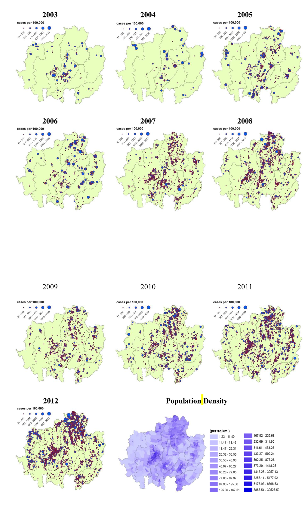 Among the 10 years analyzed, 2012 included the highest number of outbreaks, as shown in Figure 11. The highest morbidity was observed in the central regions of Chiang Mai (Mueang, Sansai and Doisaket districts) and Chiang Rai (Mueang district) provinces. Hotspots were found clustered in the northern part of Chiang Rai province and the north of Mae Hong Son province. However, the highest spatial density was observed in Chiang Rai and Phayao provinces (showed in inner ring). Although no high-morbidity area was observed in Mae Hong Son province, many hotspots (appearing in the Mueang and Pangmapha districts) and high patient case numbers per capita (second inner ring) were observed. The Moran’s I and NN values for this province were also high. In 2012, the 3rd and 4th inner rings showed the highest clustering in Phrae province, although fewer hotspots and lower morbidity were seen in this province. In this year, most provinces, including Mae Hong Son, Chiang Rai and Phayao, exhibited a clear increase in outbreaks during June and August (rainy season).