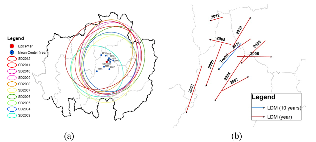 (a) HFMD Mean Center and Standard Deviation Ellipse and (b) Linear Directional Mean from 2003 to 2012.